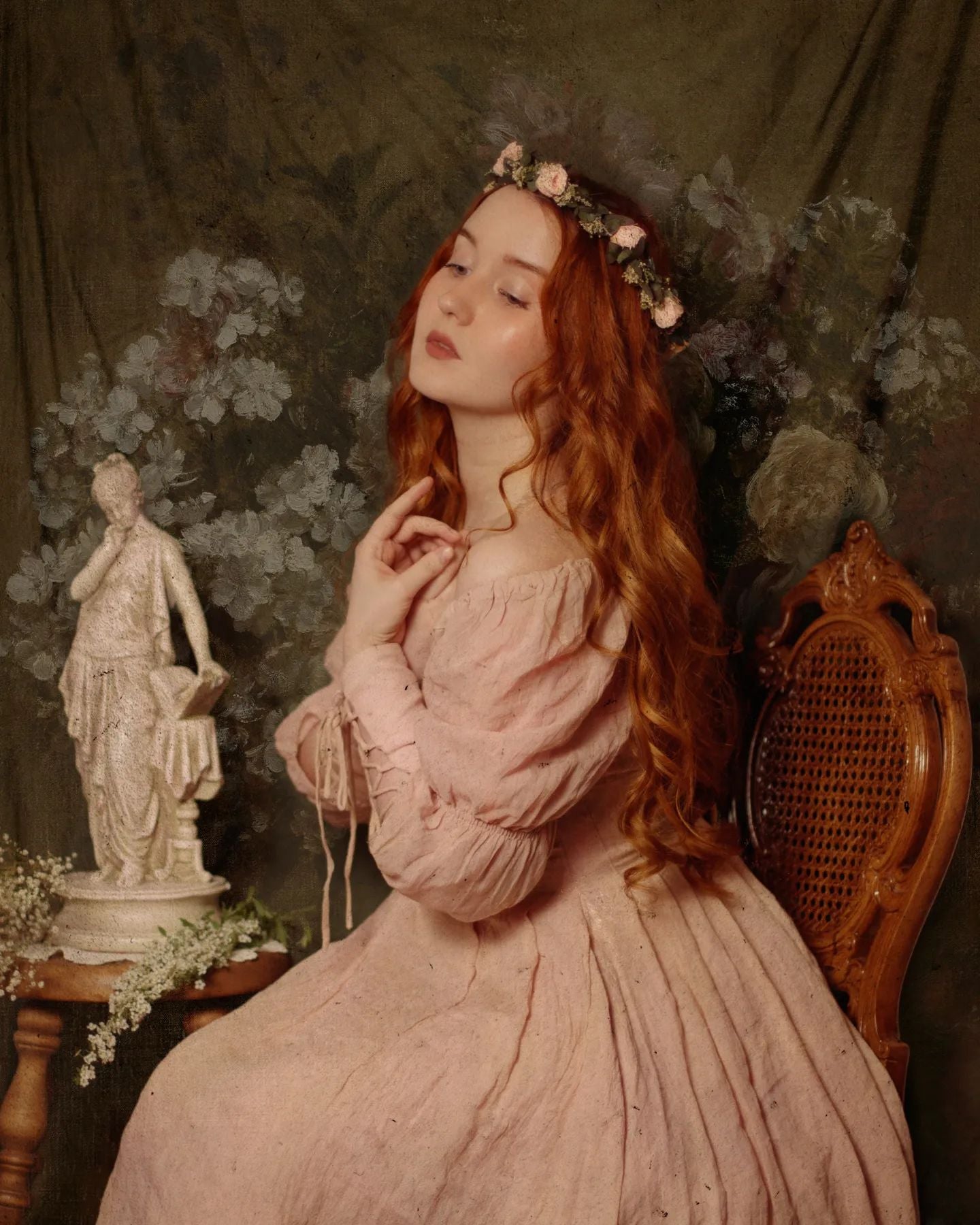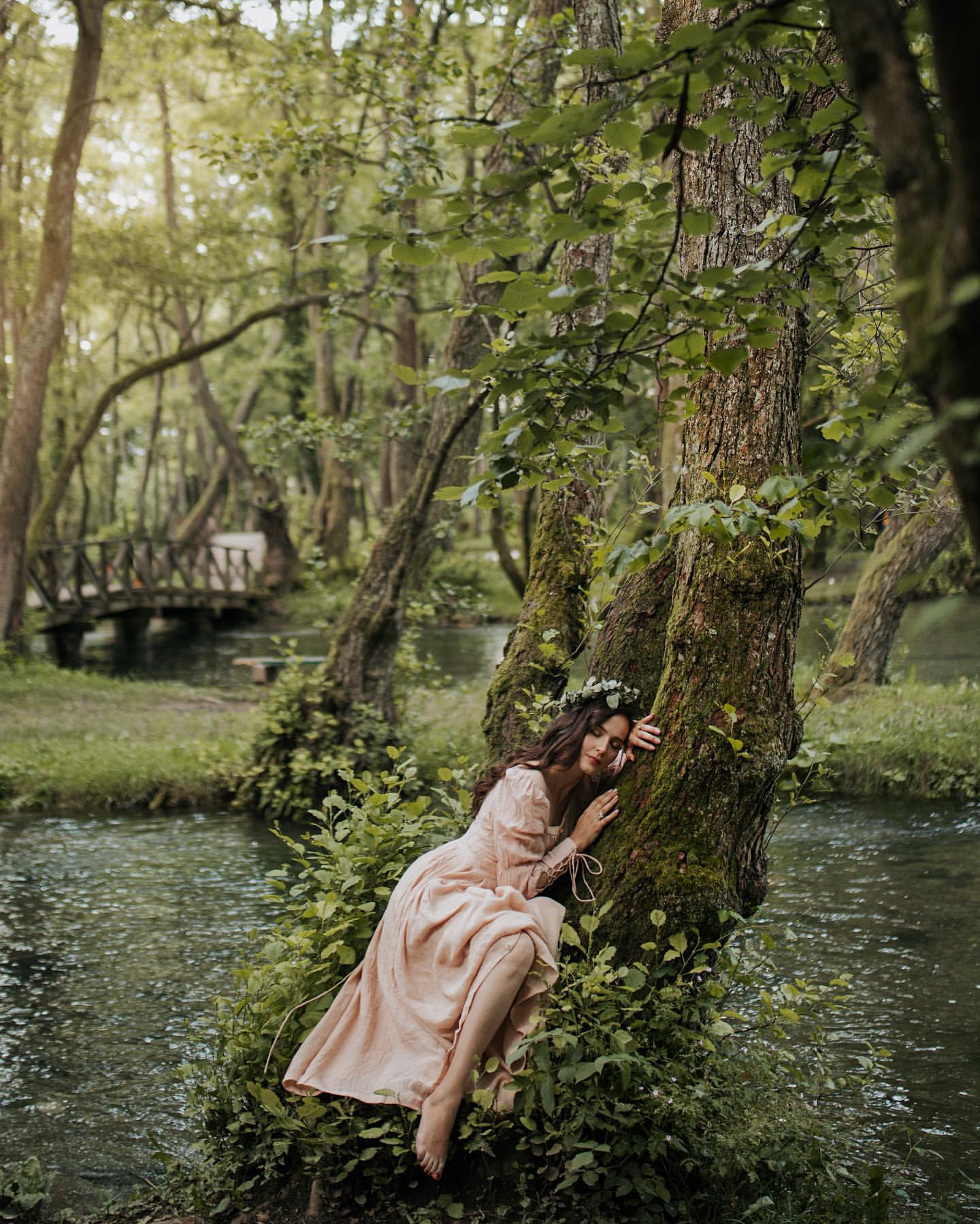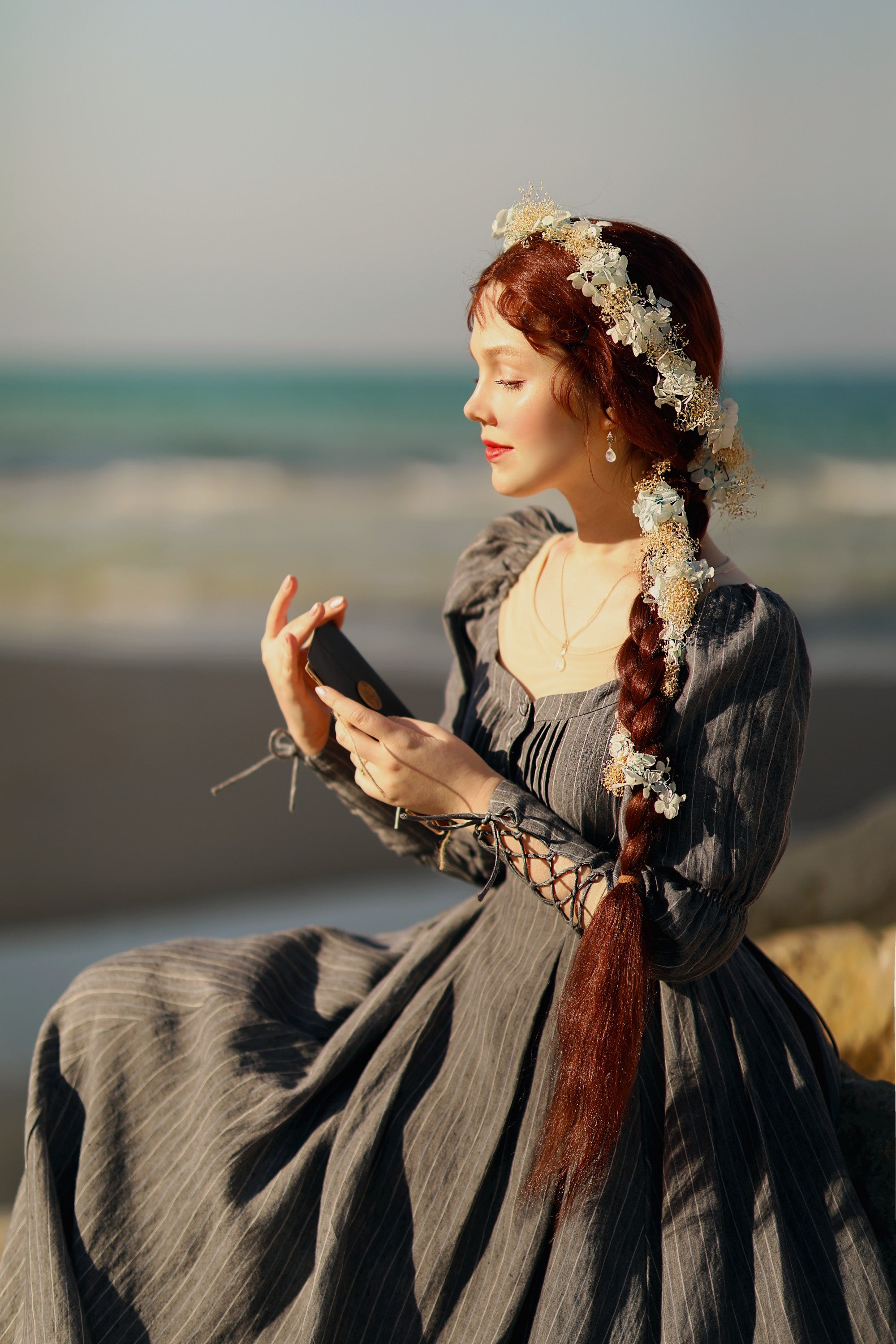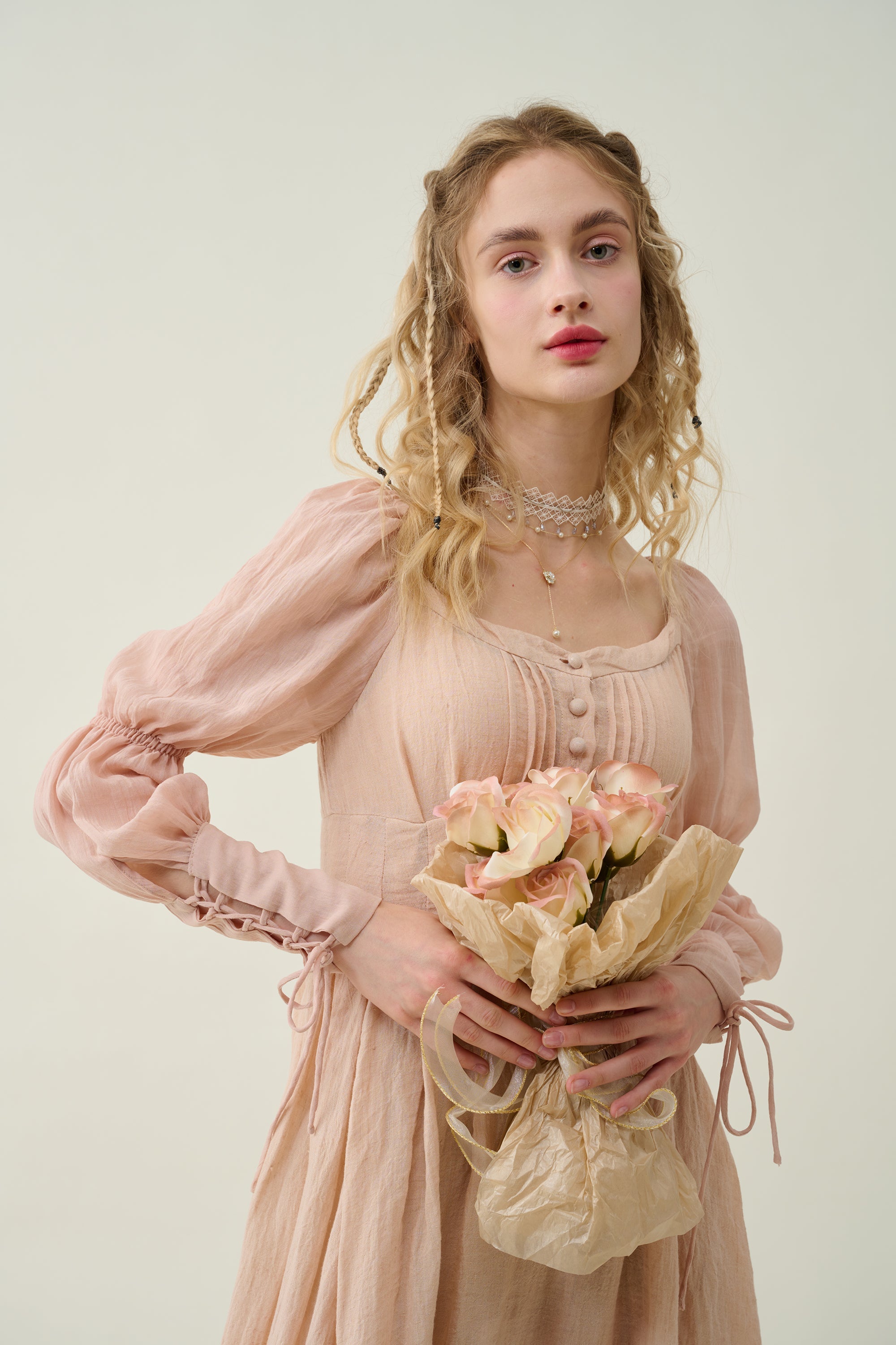 Crafted from soft linen, the piece is enhanced with a smocked bodice and button closure for added texture. It is a combination of elegance and romance.