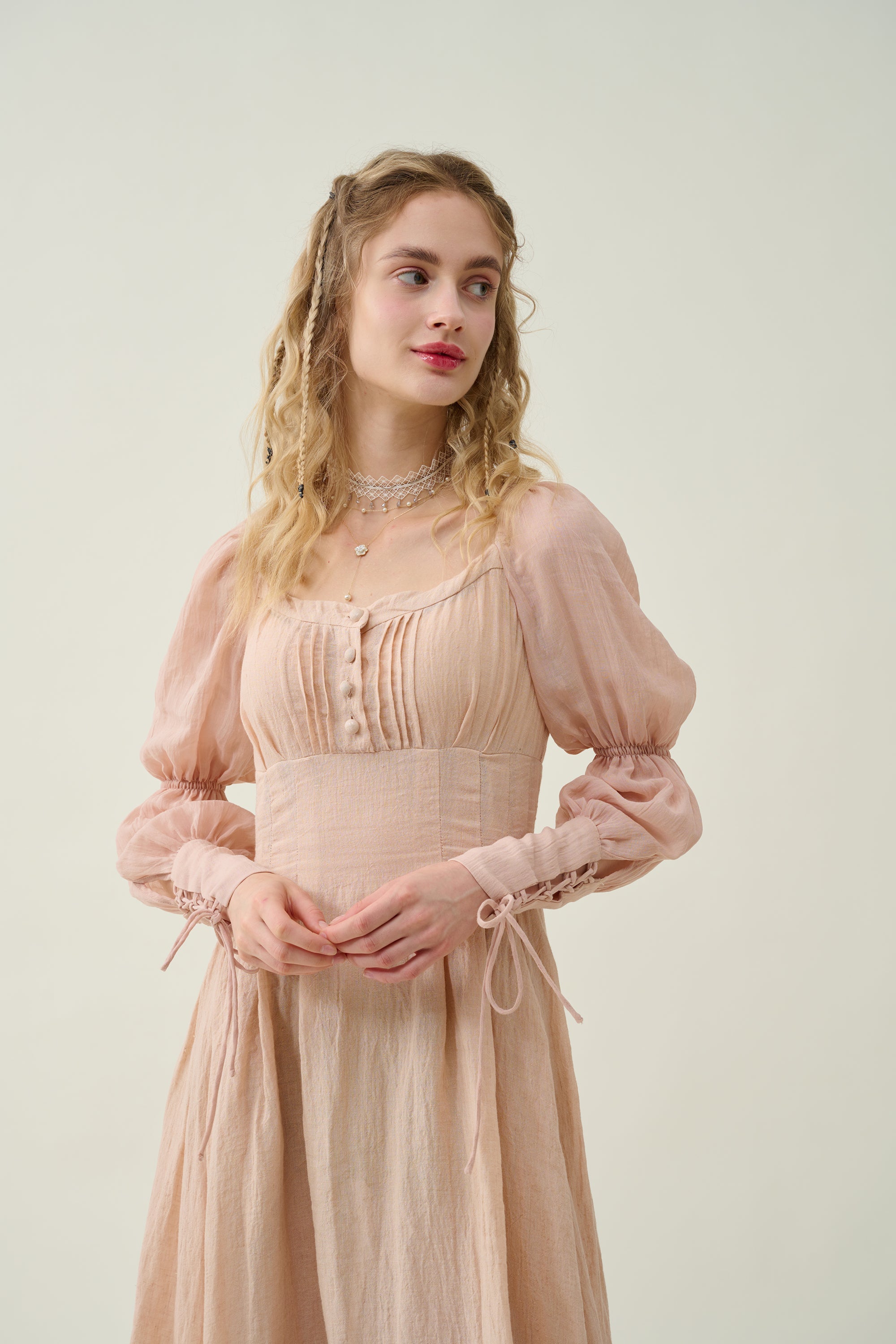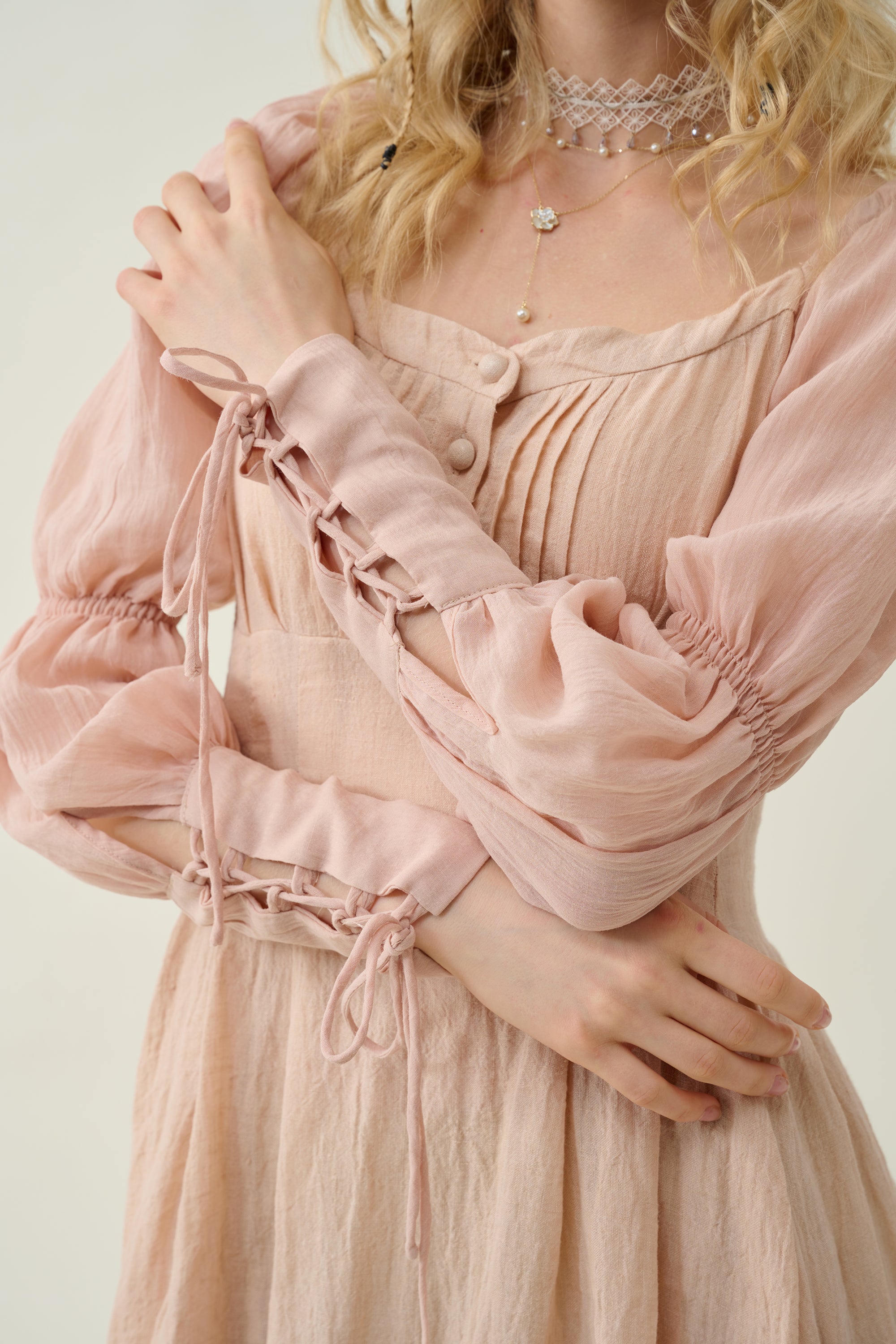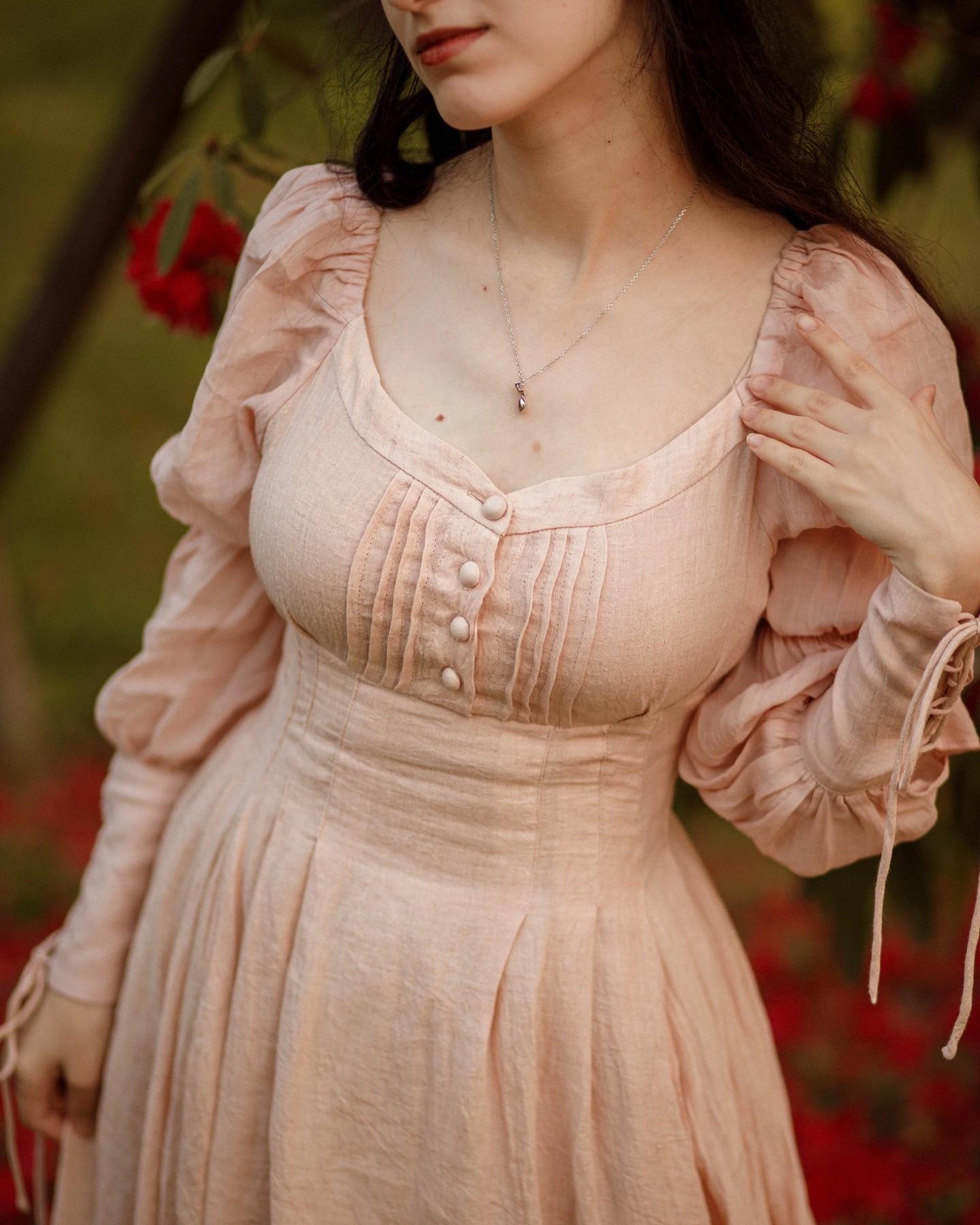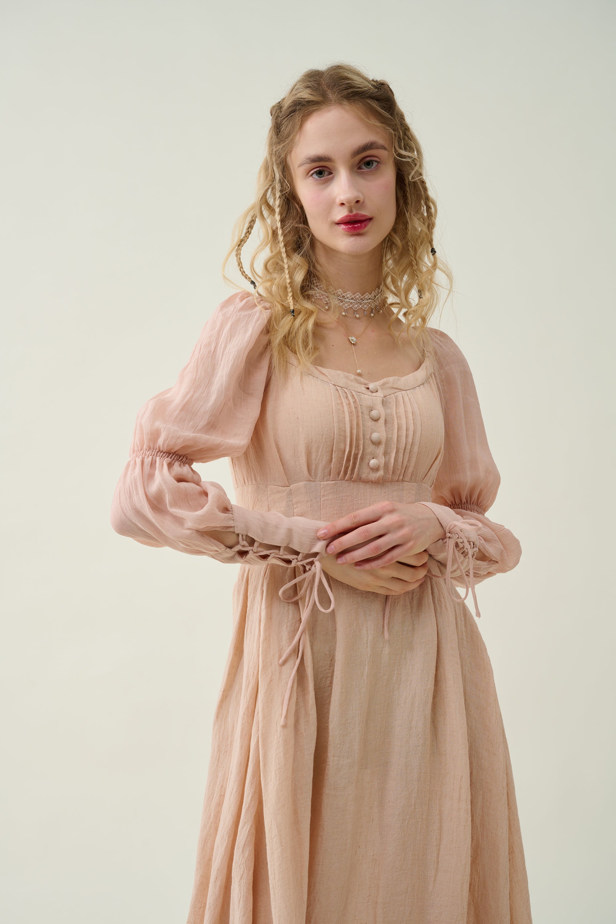 Sleeves: 80% silk, 20% linen. Dyed in same color as the main dress.