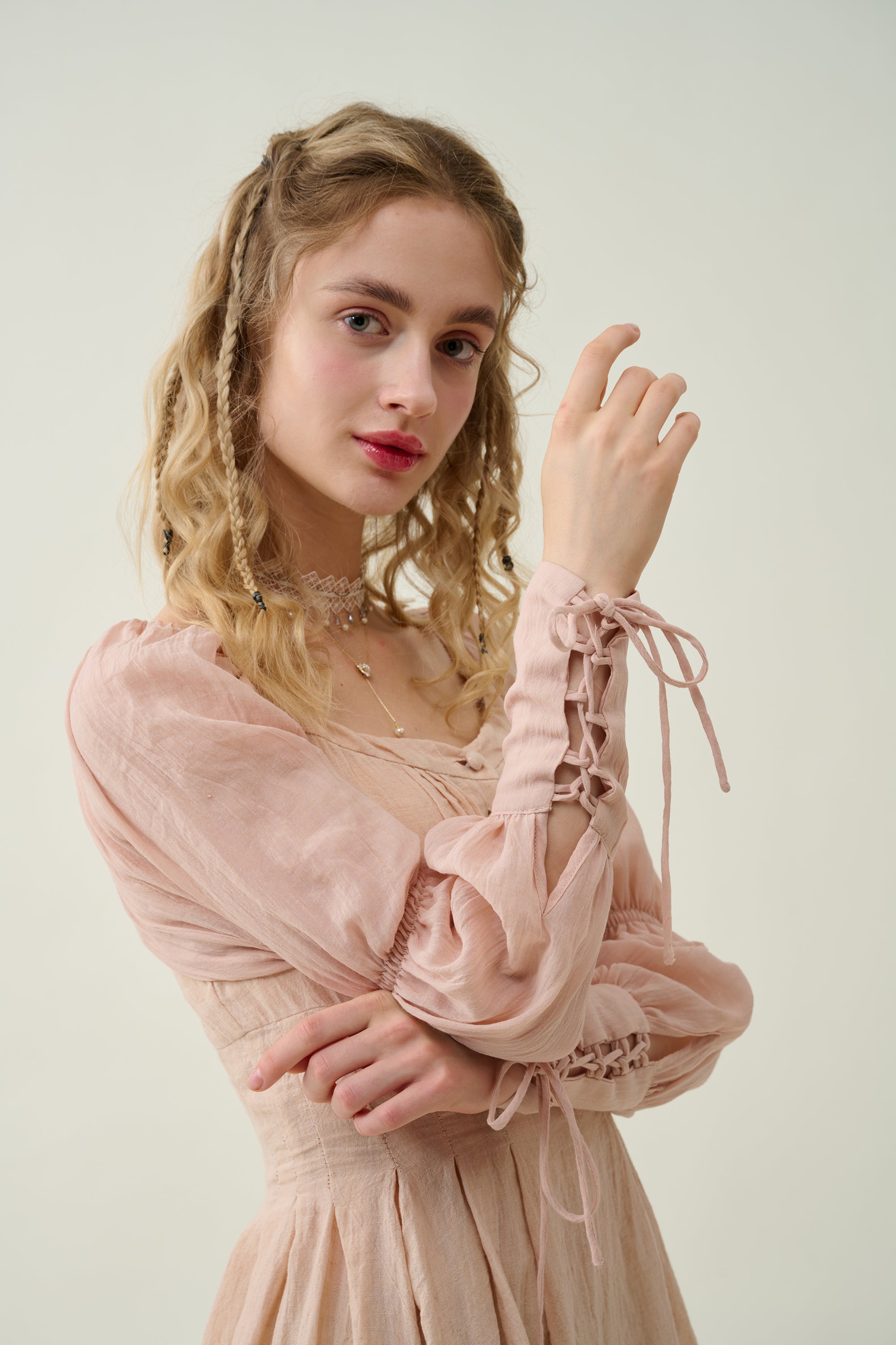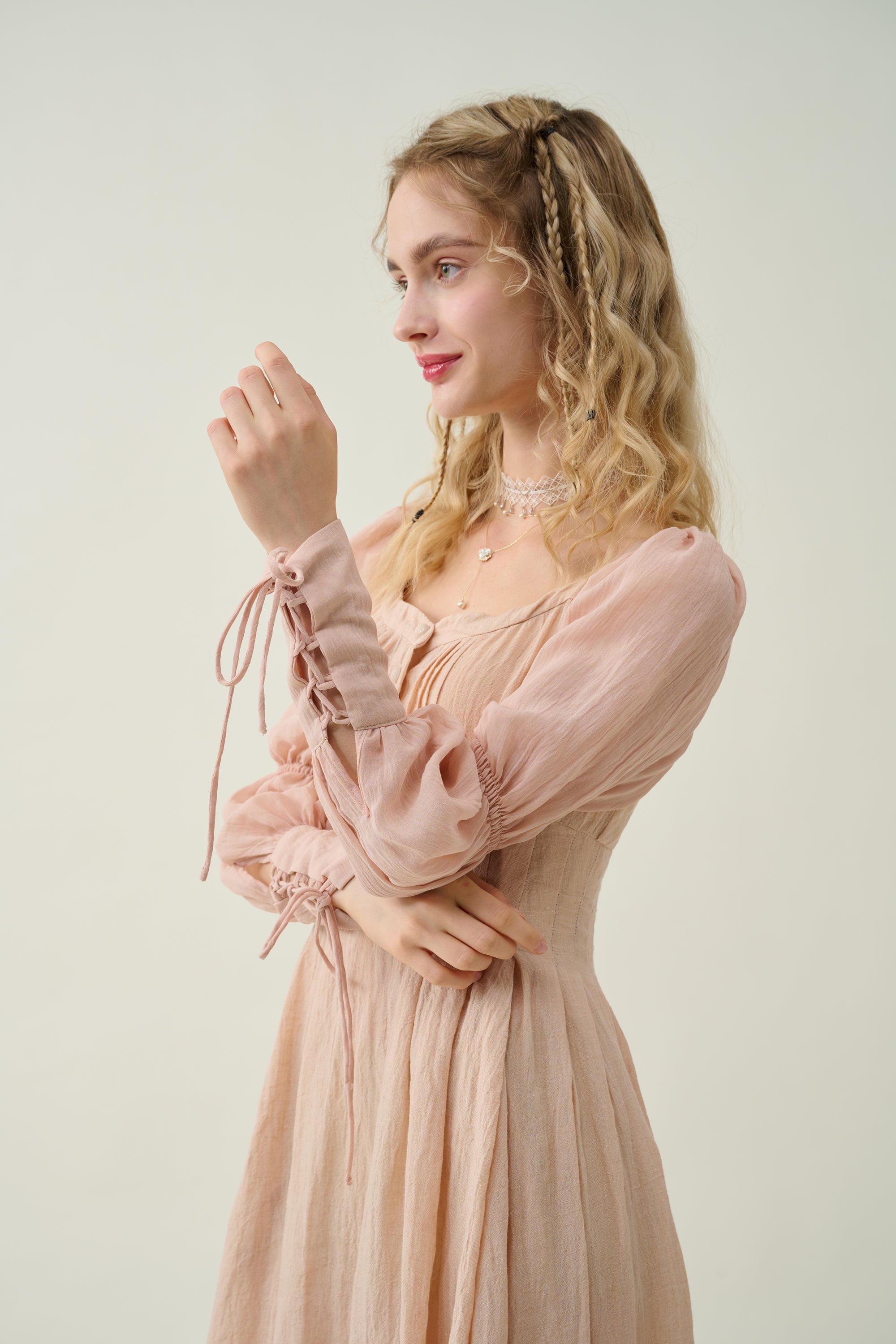It's cut to an empire line silhouette framed by puff sleeves and a delicate sweetheart neck. the elasticated lacing-up sleeves with pleated detail exude vintage elegance. Winning combination.