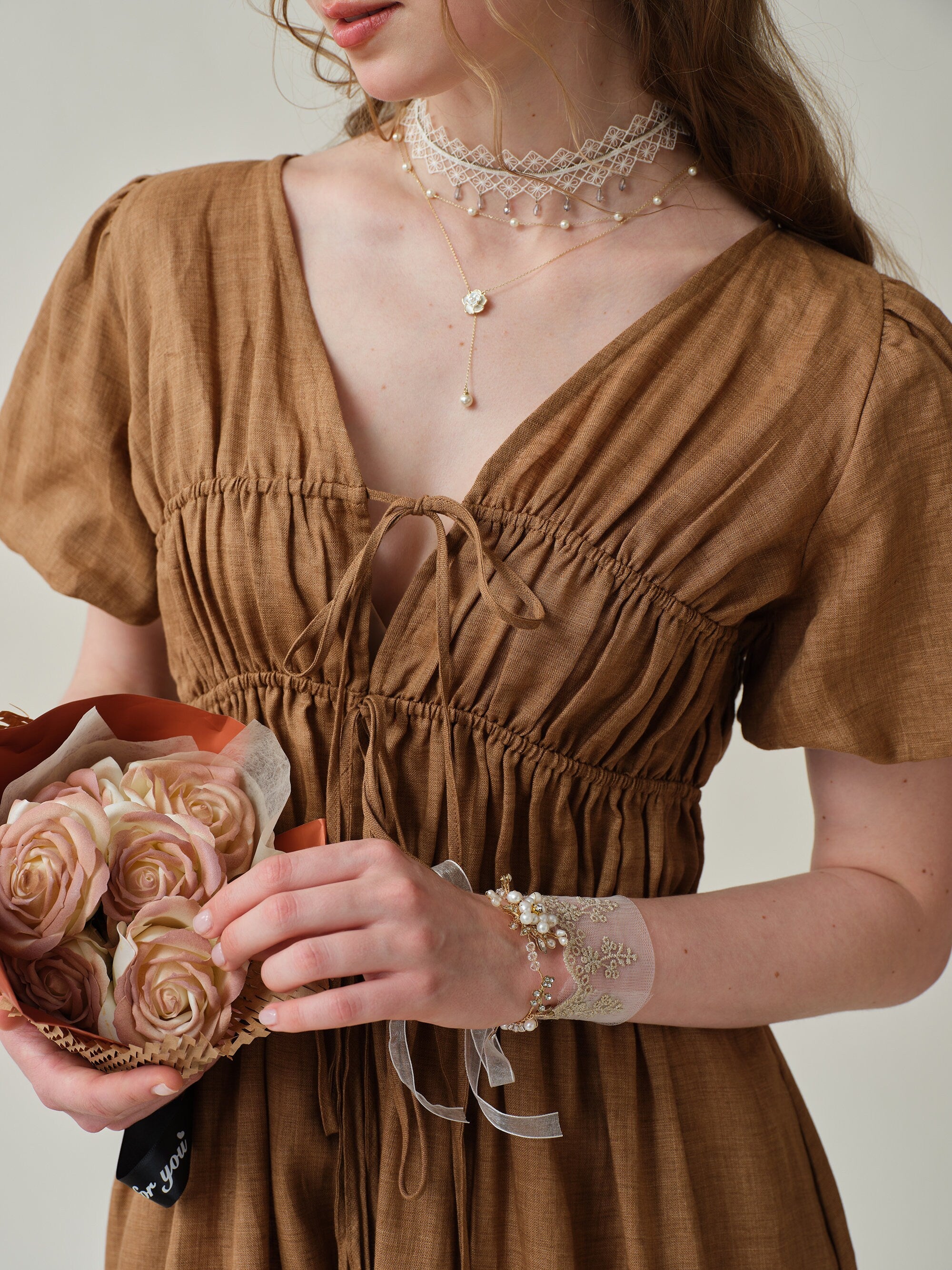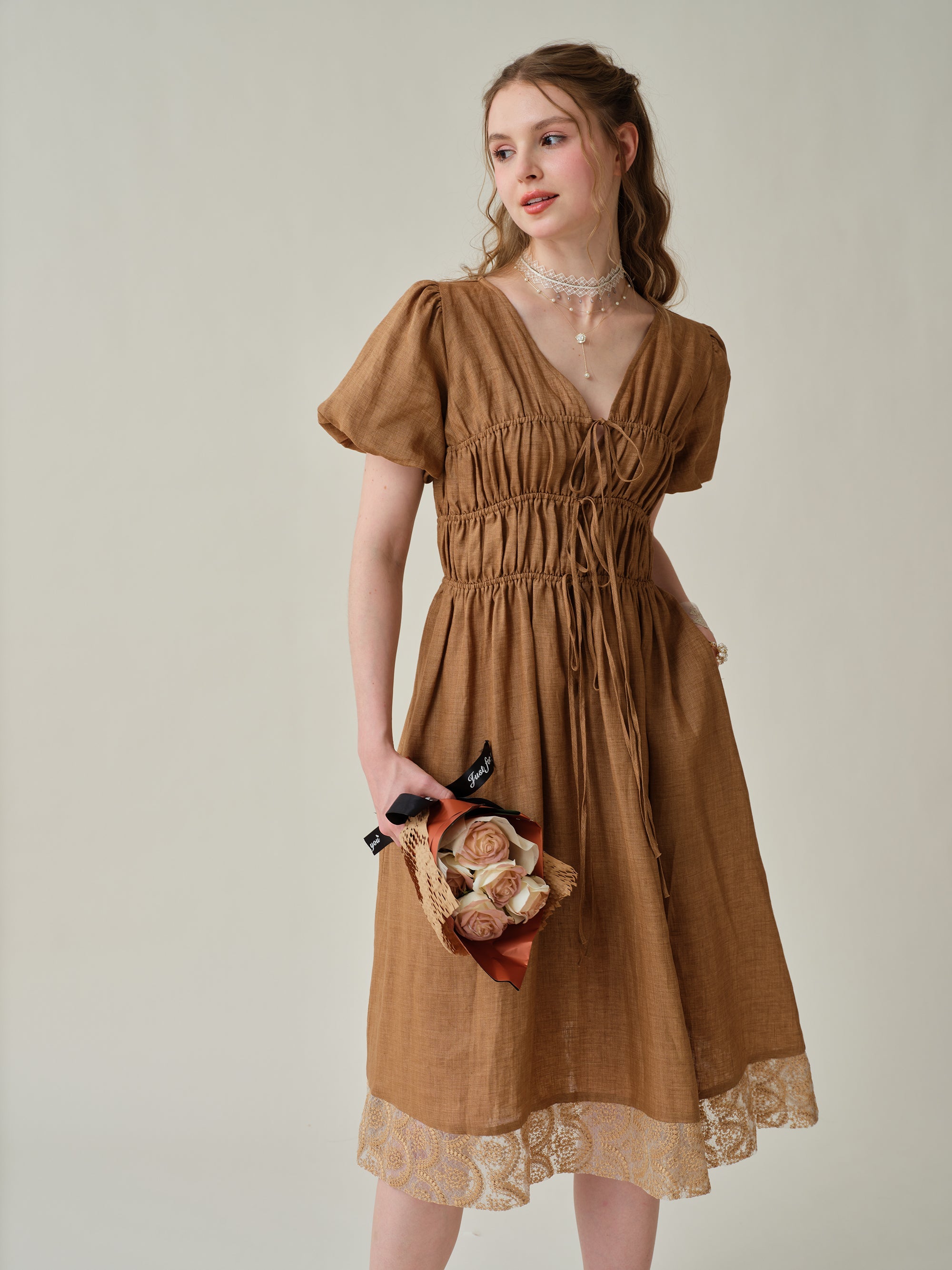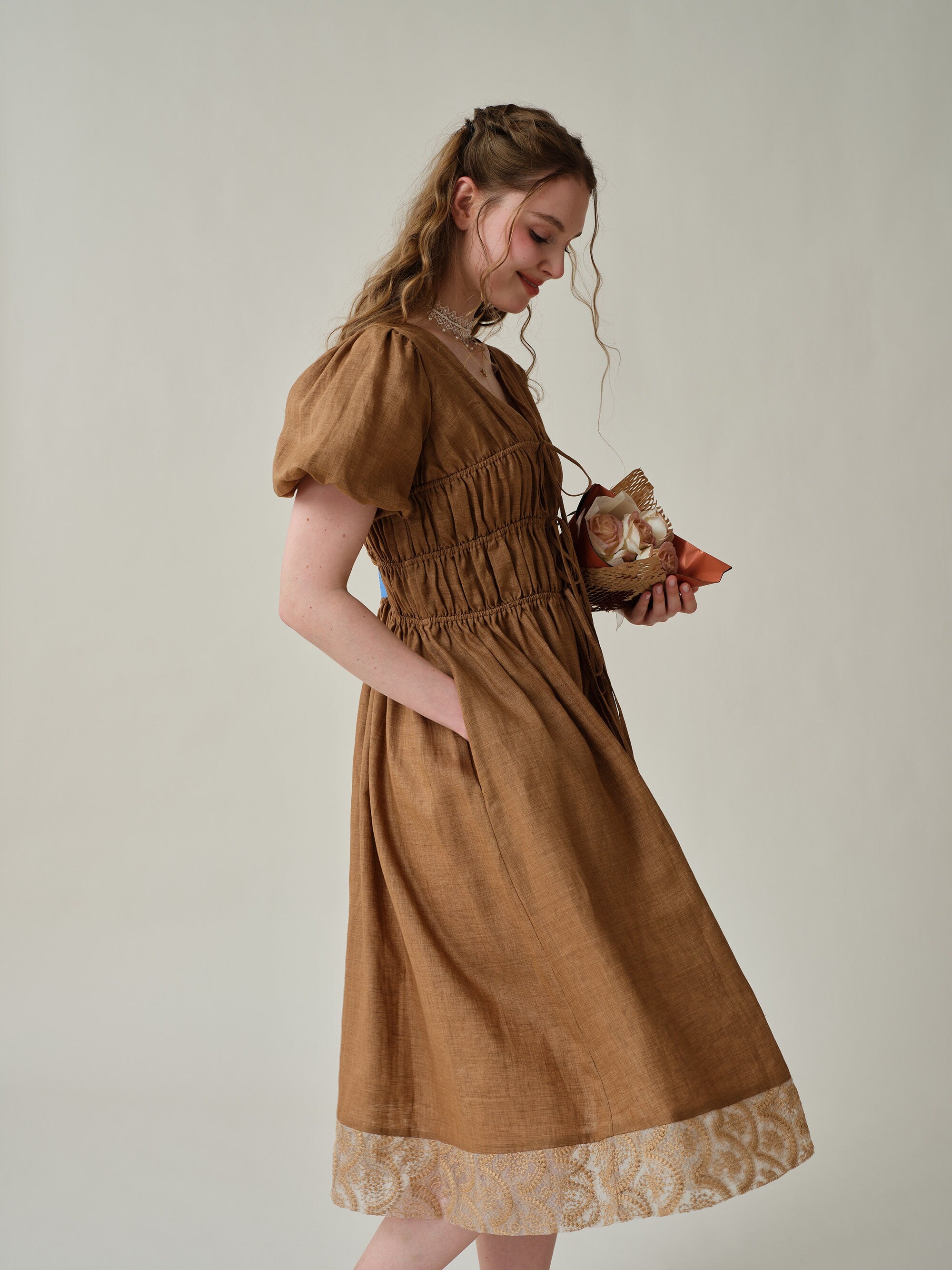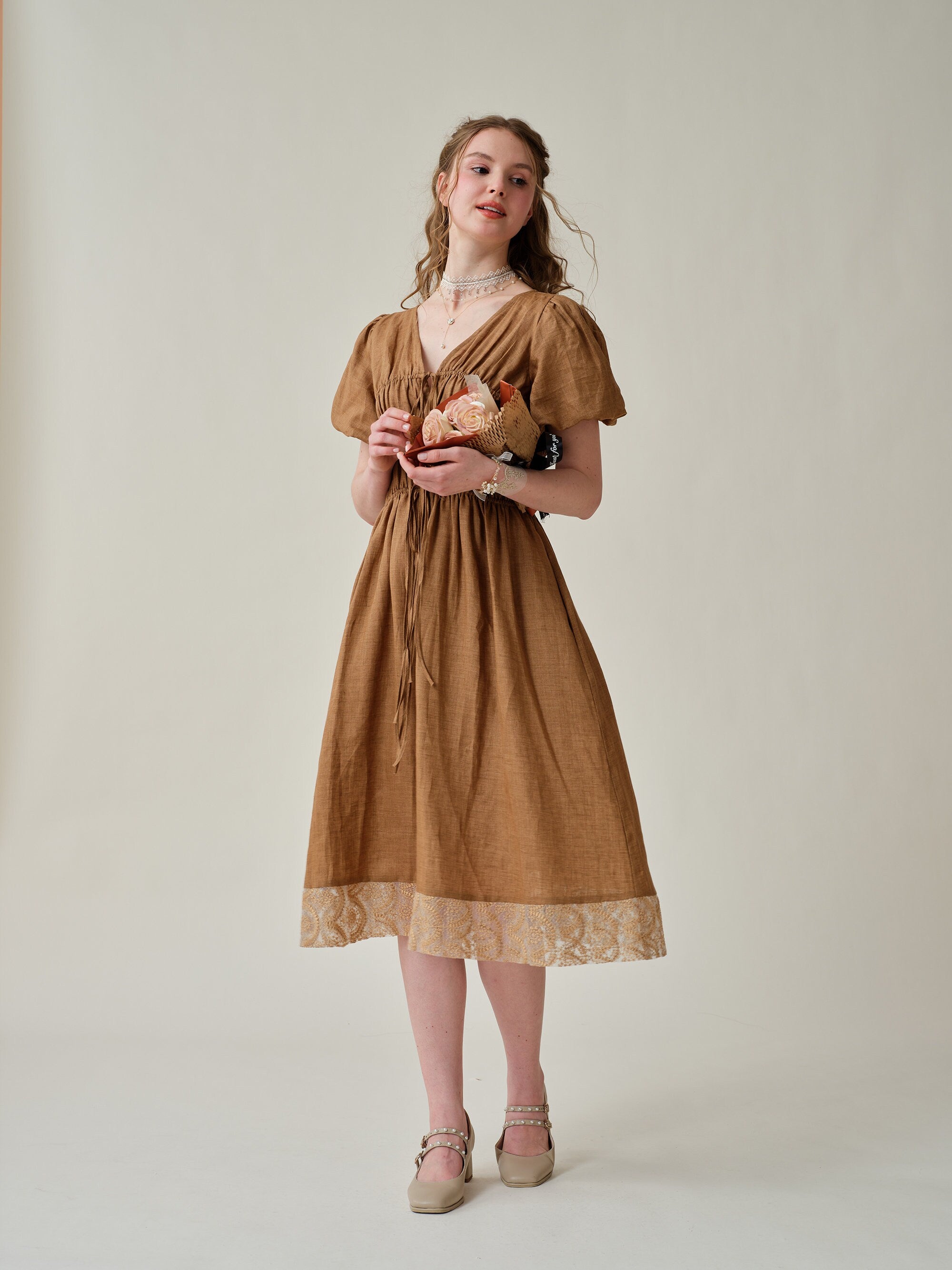 ps: The wheat dress is decorated with delicate lace embroidery at the hem, will create graceful movement as you walk, exuding effortless elegance .