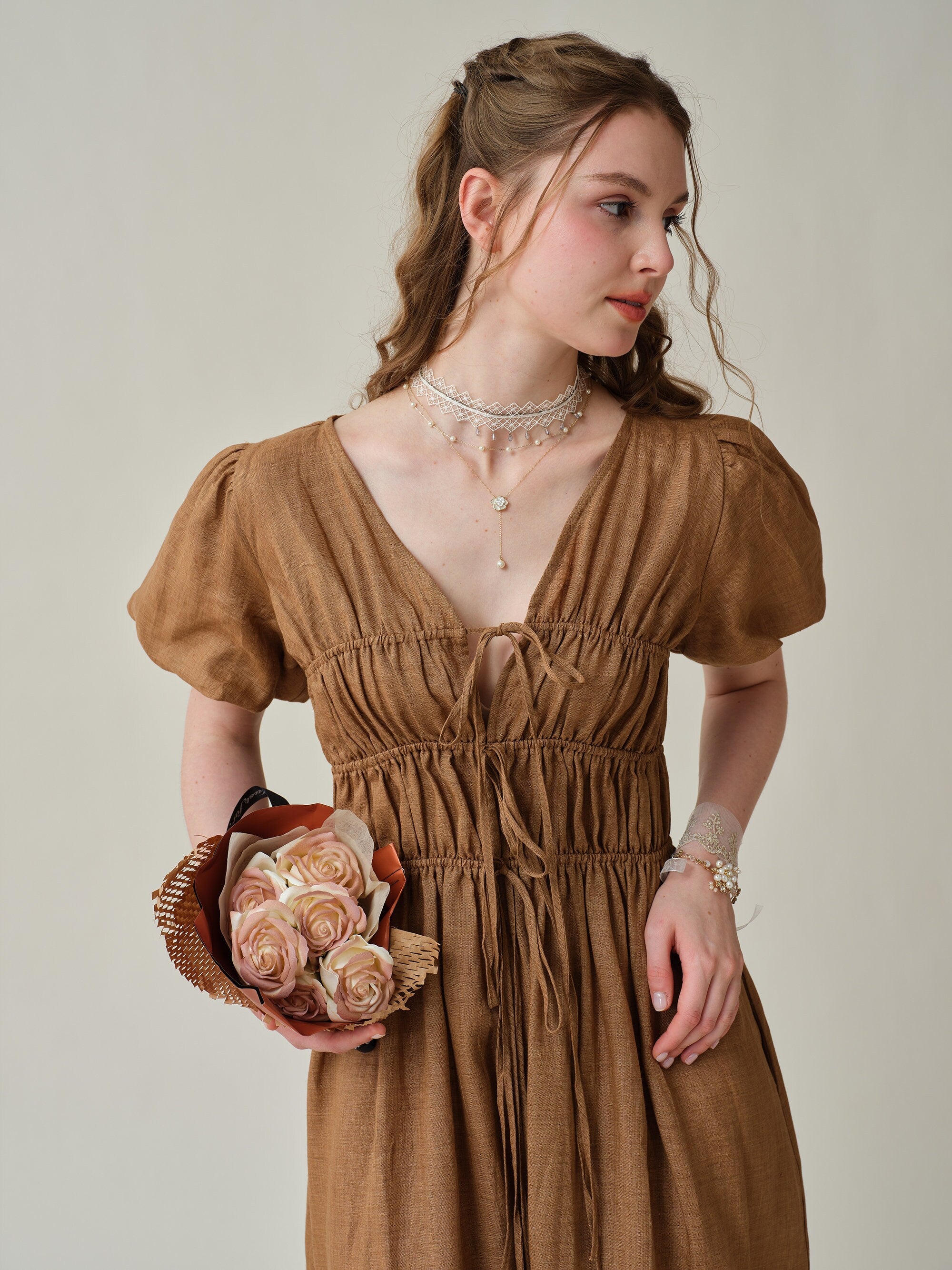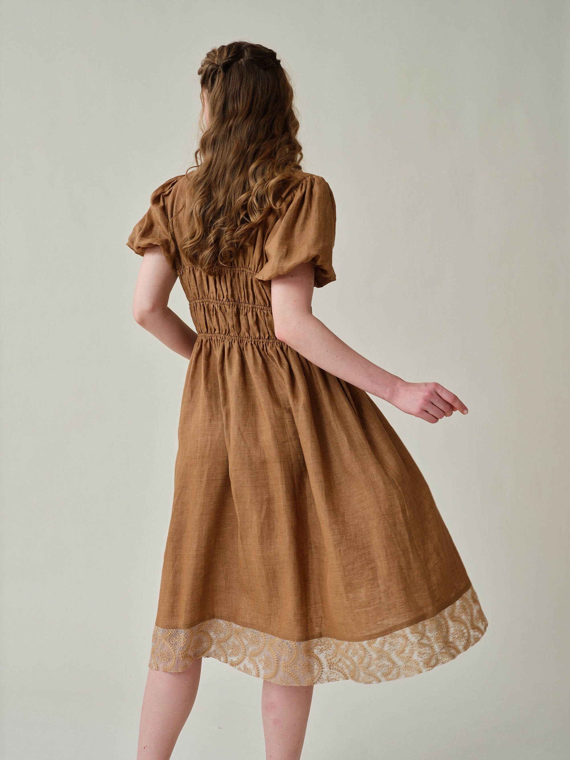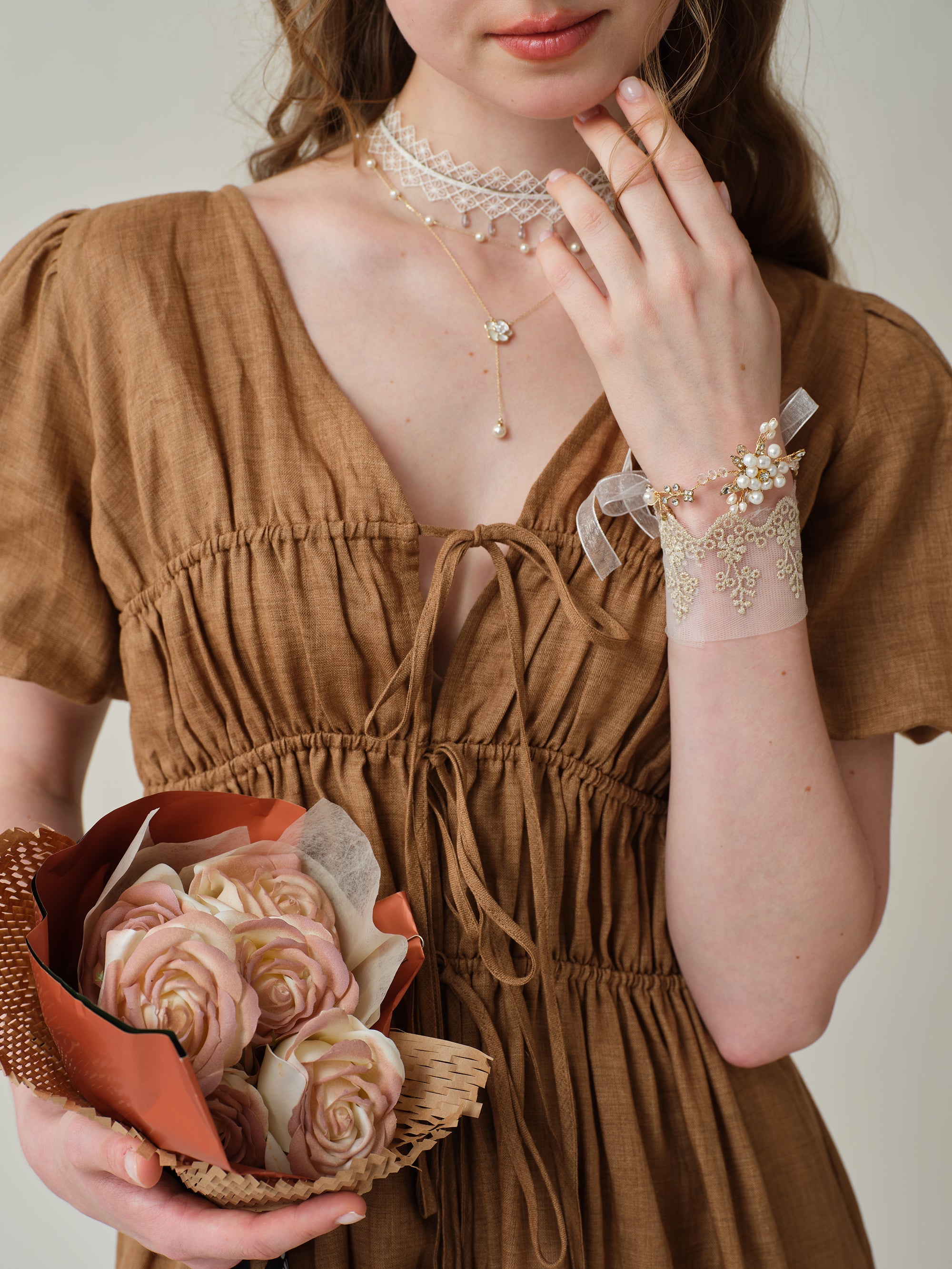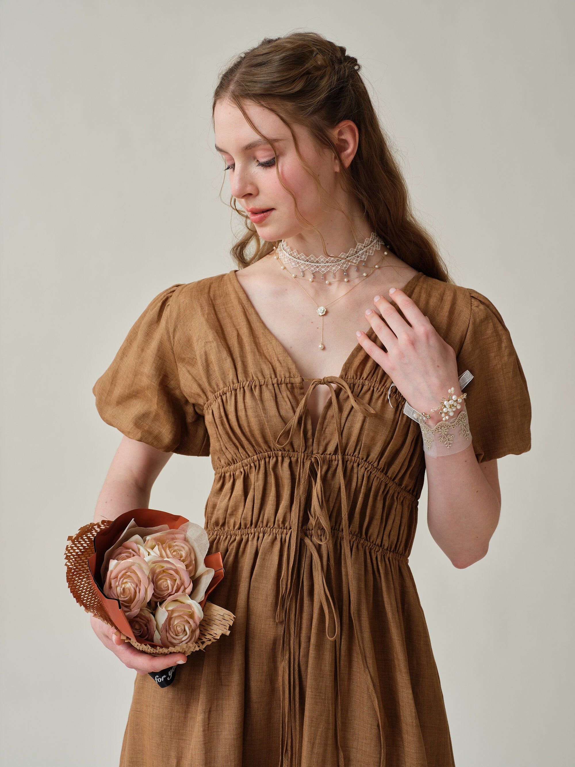 ps: The wheat dress is decorated with delicate lace embroidery at the hem, will create graceful movement as you walk, exuding effortless elegance .