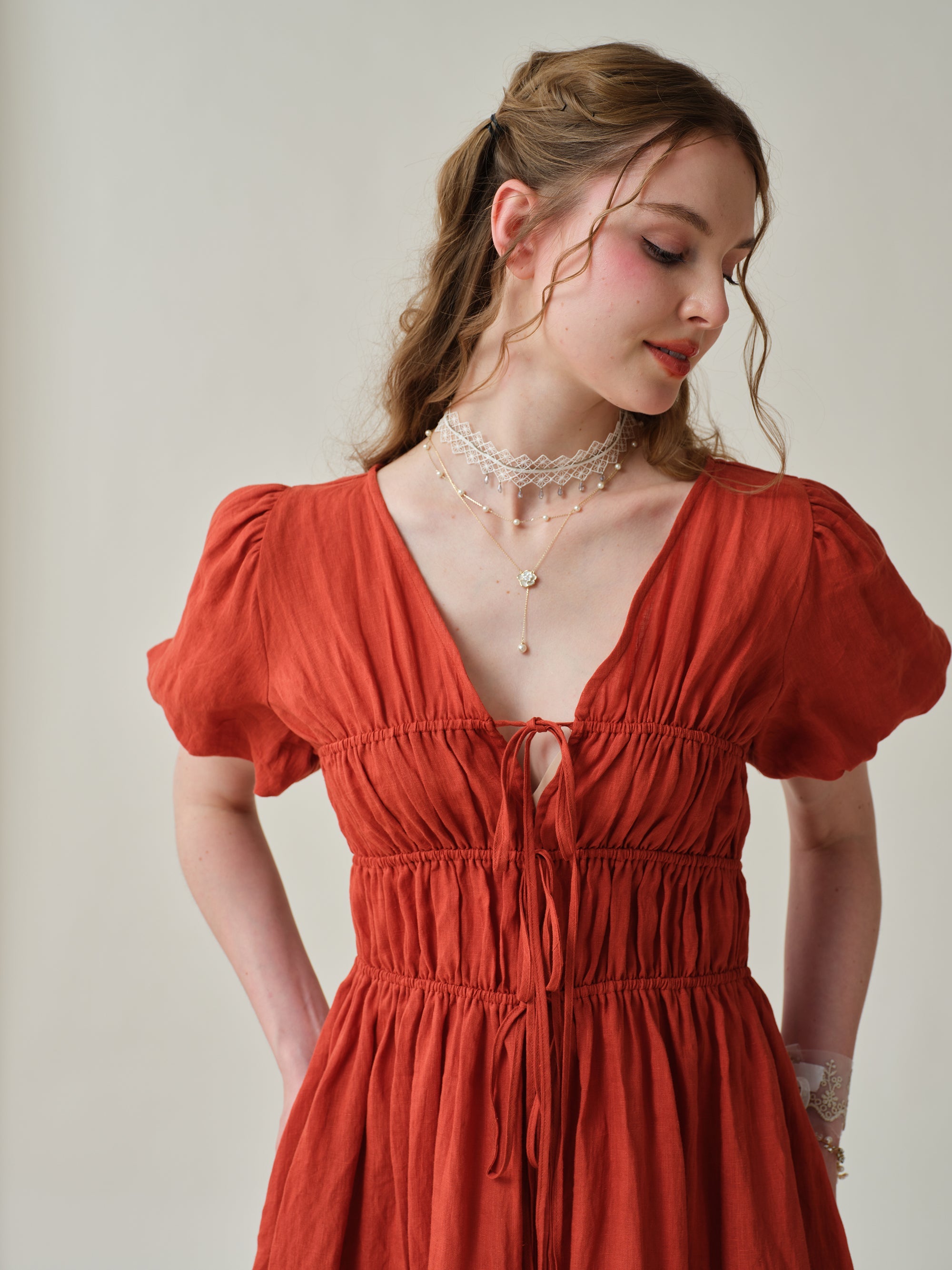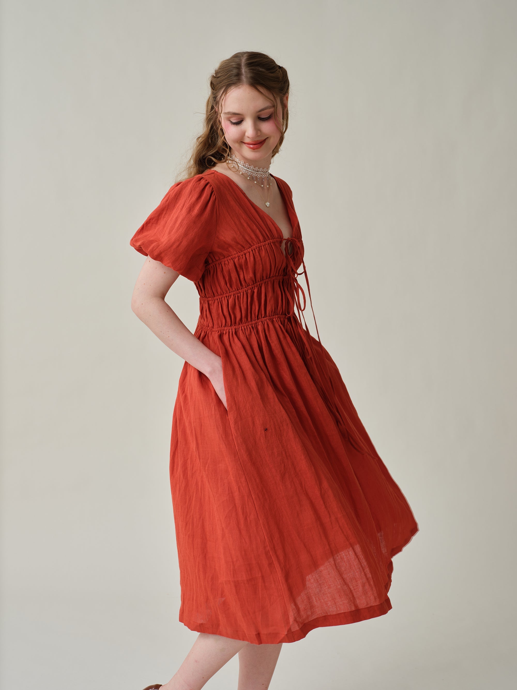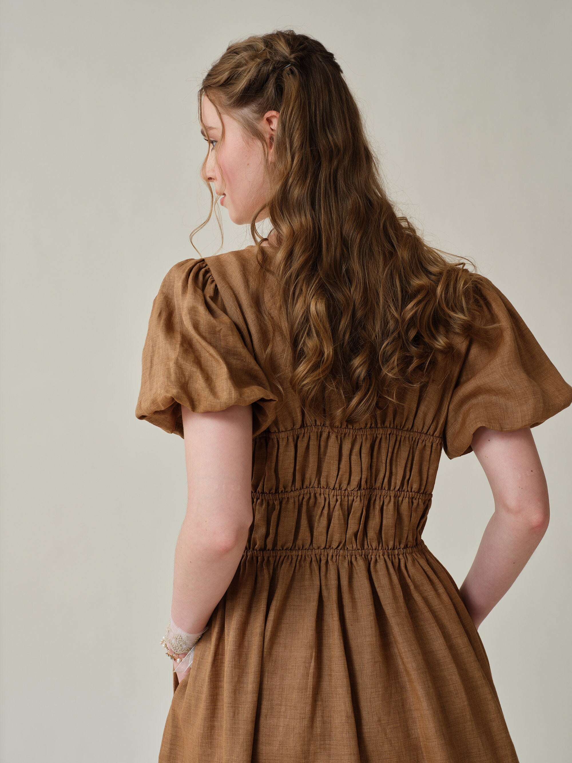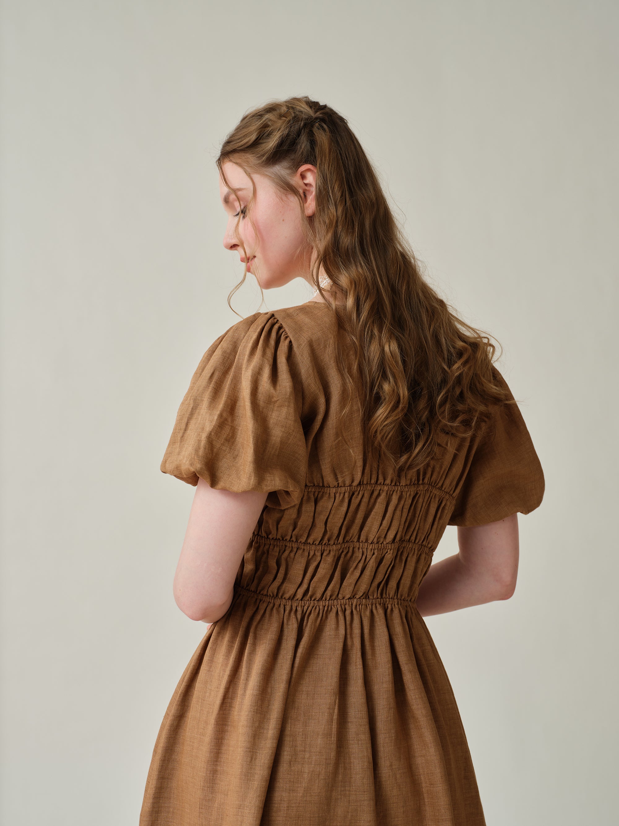 Linennaive's affinity for cuts, shapes and textures is captured in this structured dress. made from linen in a relaxed silhouette so it has a soft, lightweight handle. Elasticated cuffs enhance the voluminous puff sleeves, whilst the shirred waist accentuates the romantic silhouette all the more.