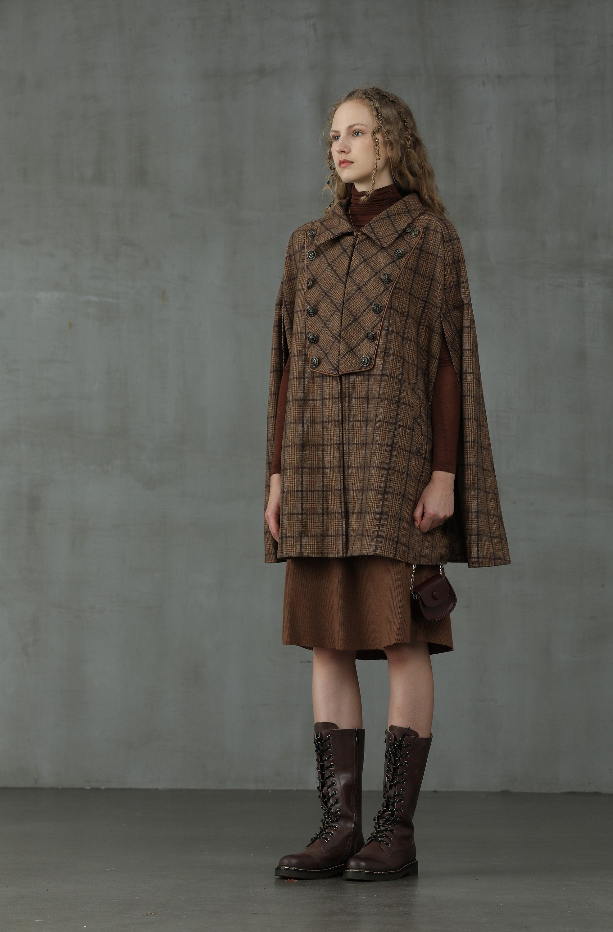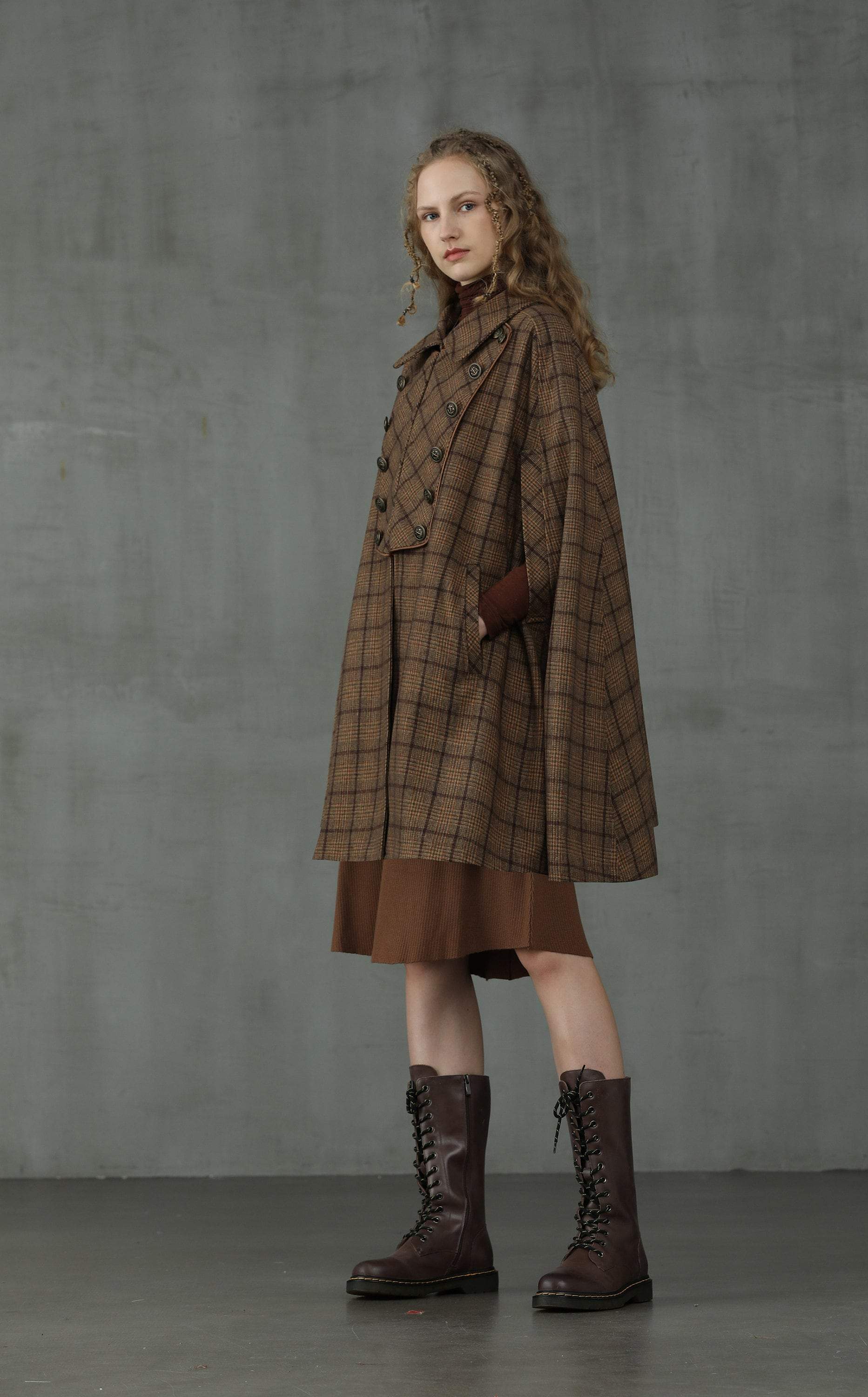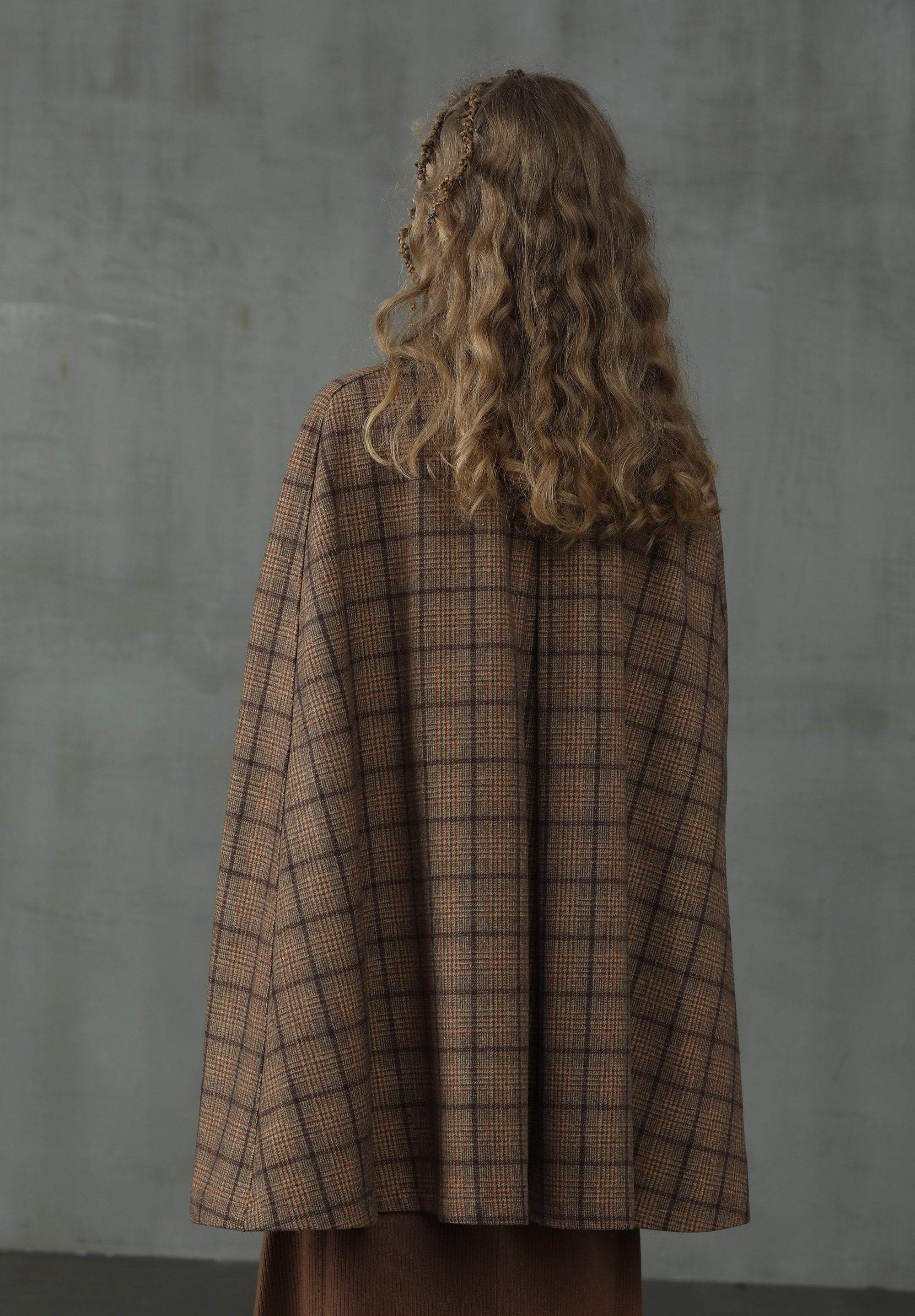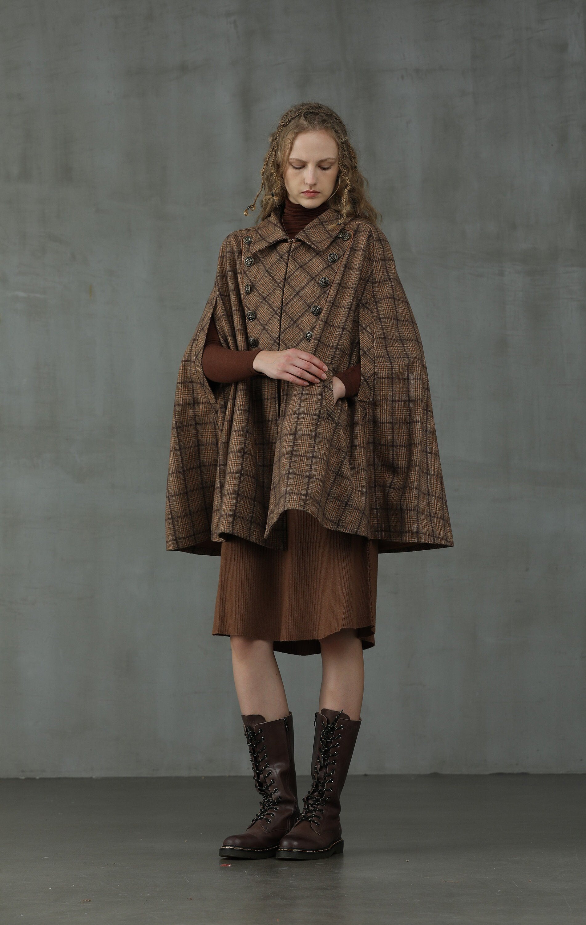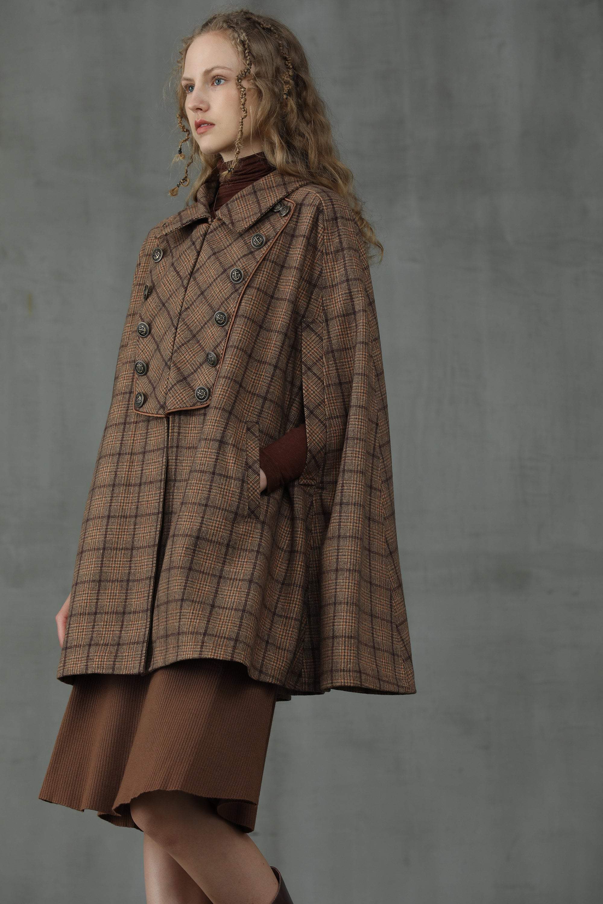 This brown wool cape from Linennaive is decorated in the tartan print. The gold-tone buttons add a lavish finish.