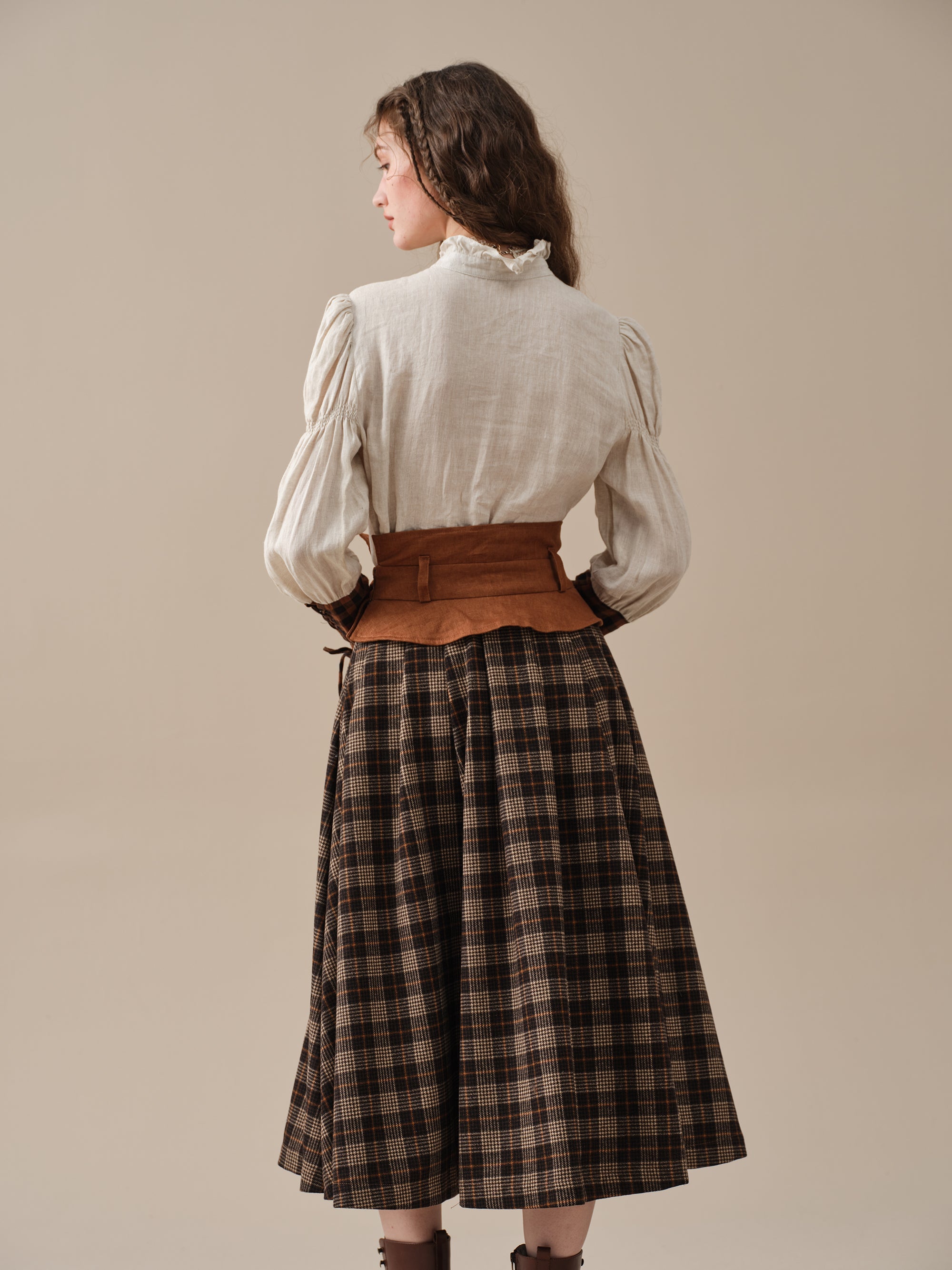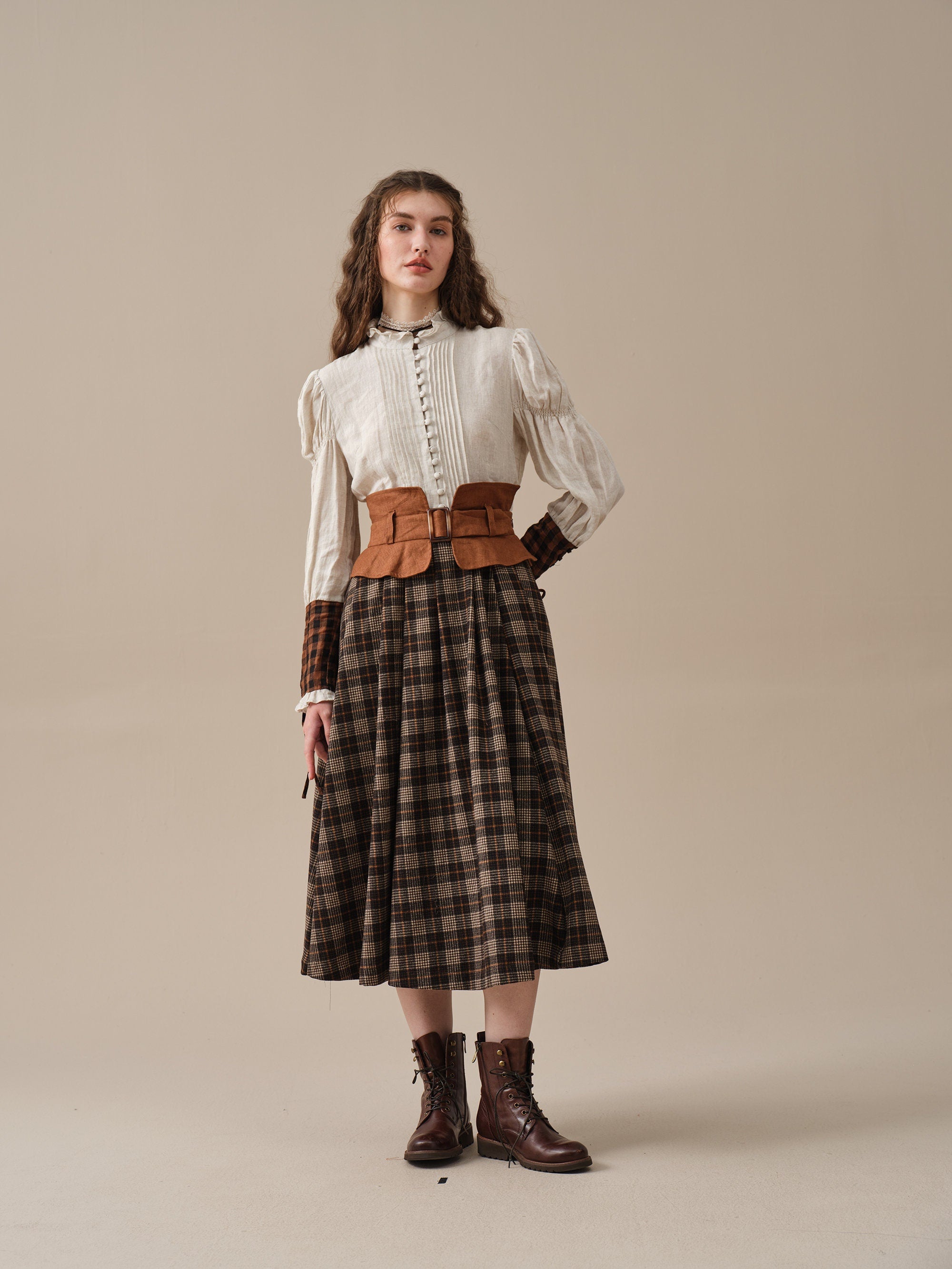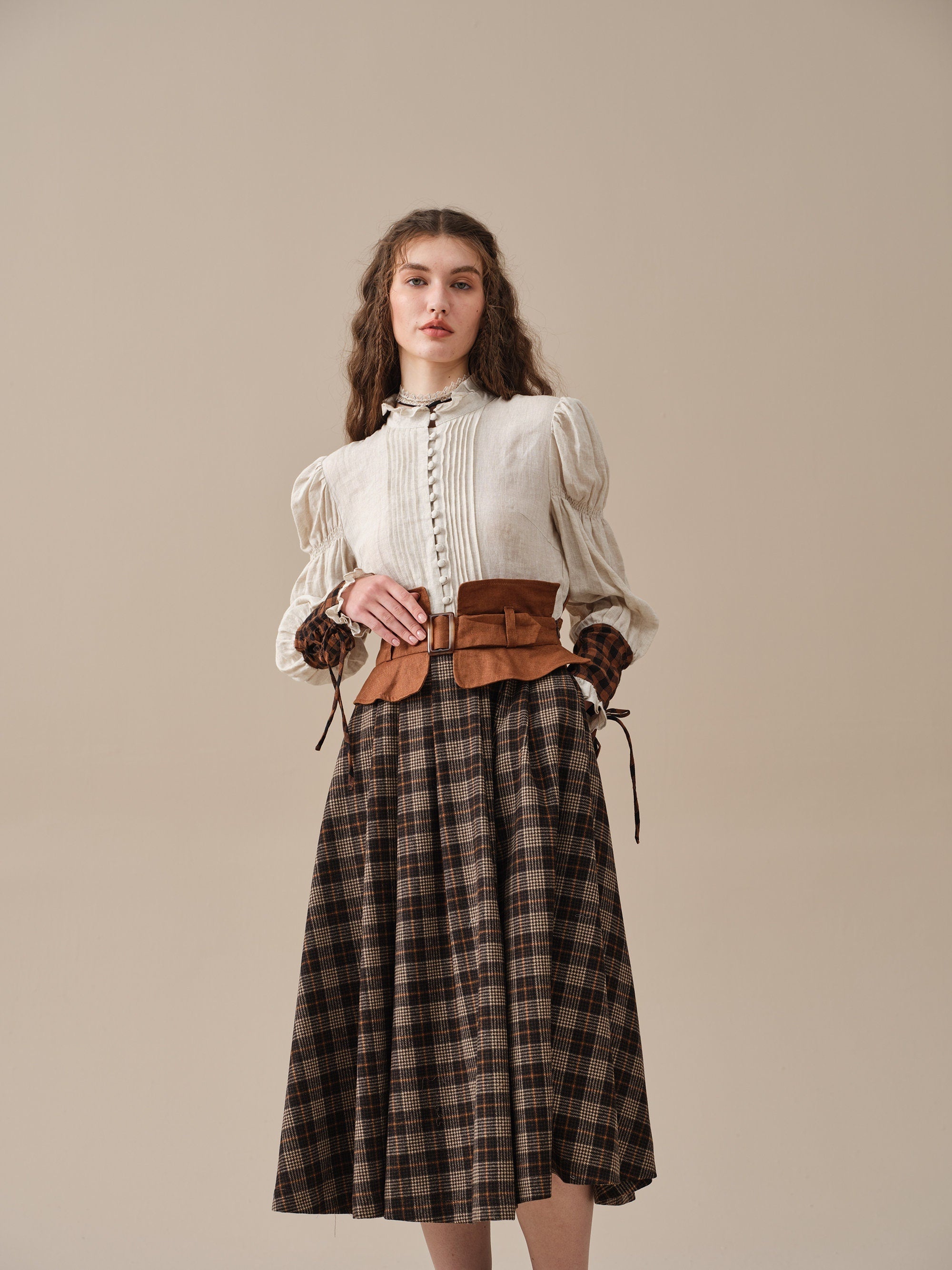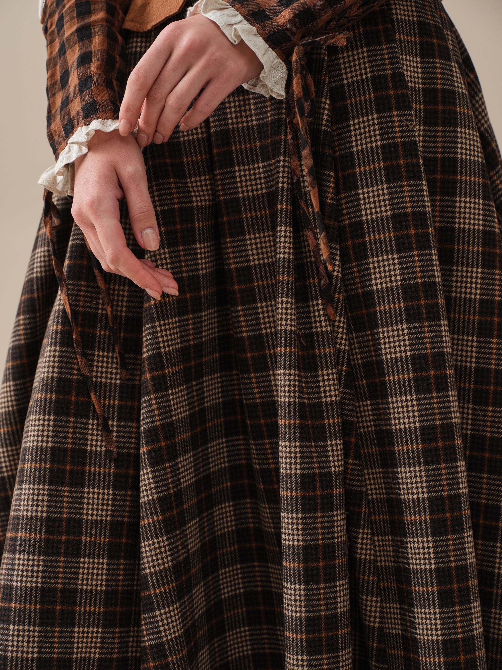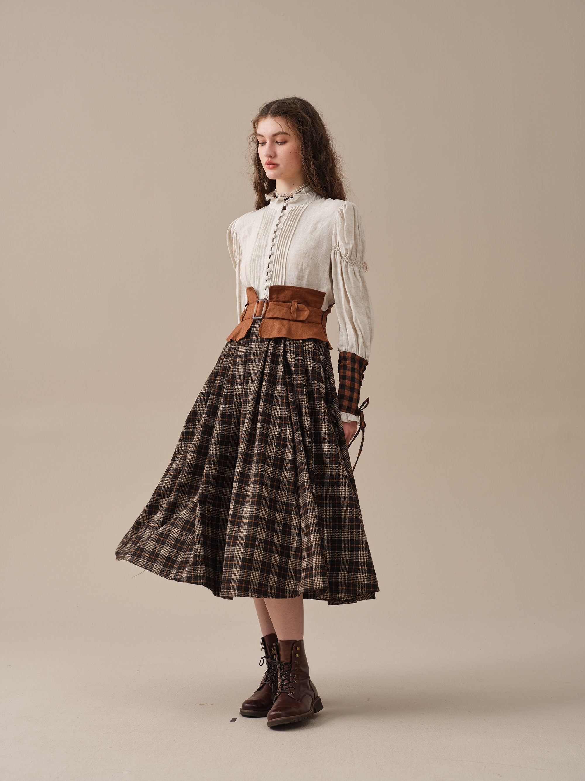 Made from premium wool, this skirt is a warm embrace that will keep you enchanted throughout the day. The skirt's graceful silhouette and delicate plaid pattern evoke a sense of romance, transporting you to a bygone era of refined charm.
