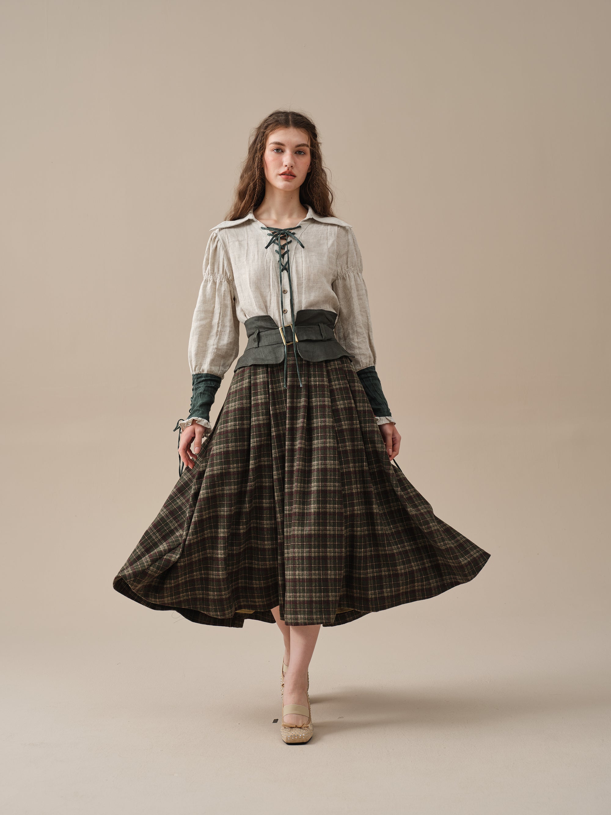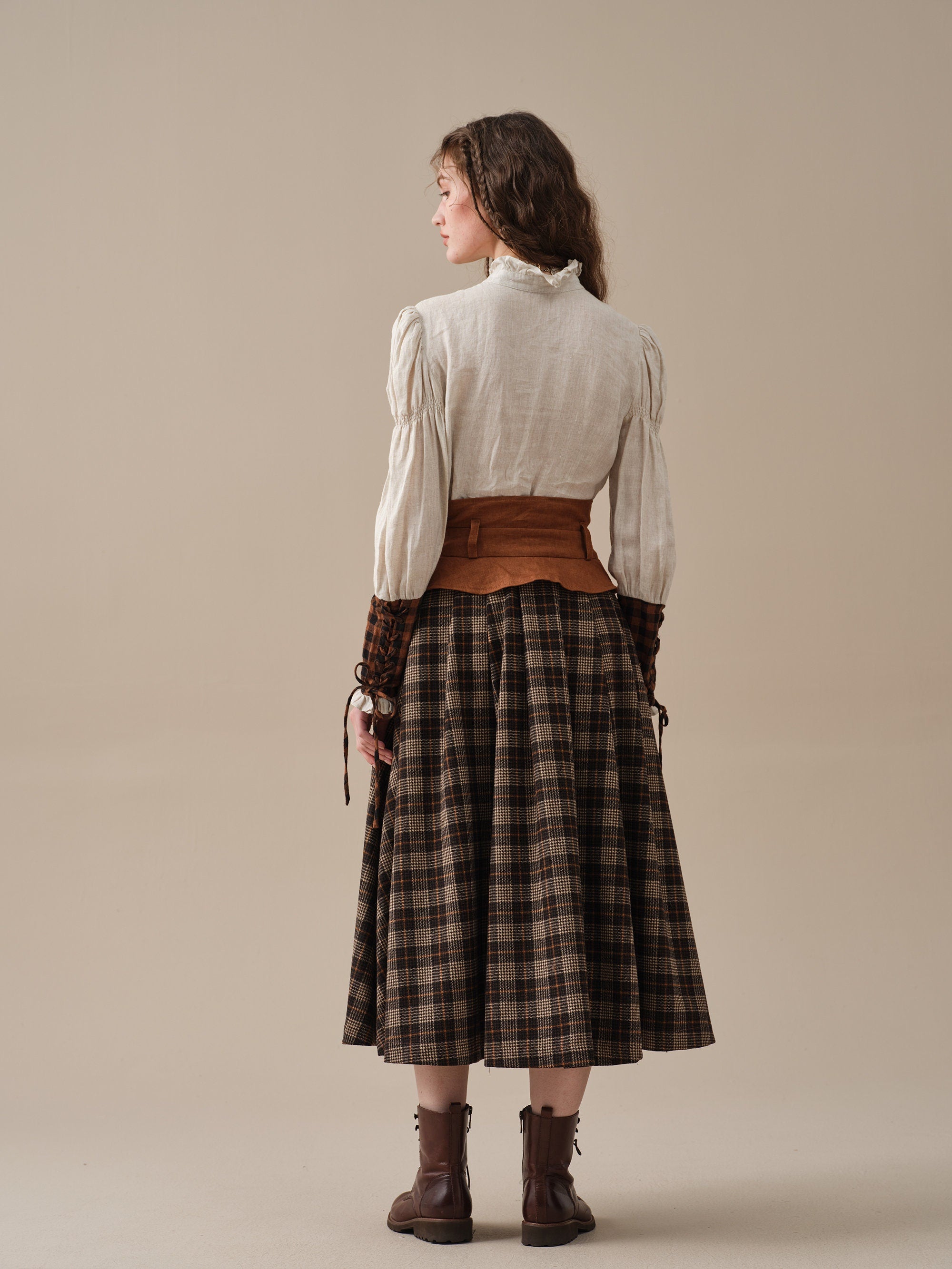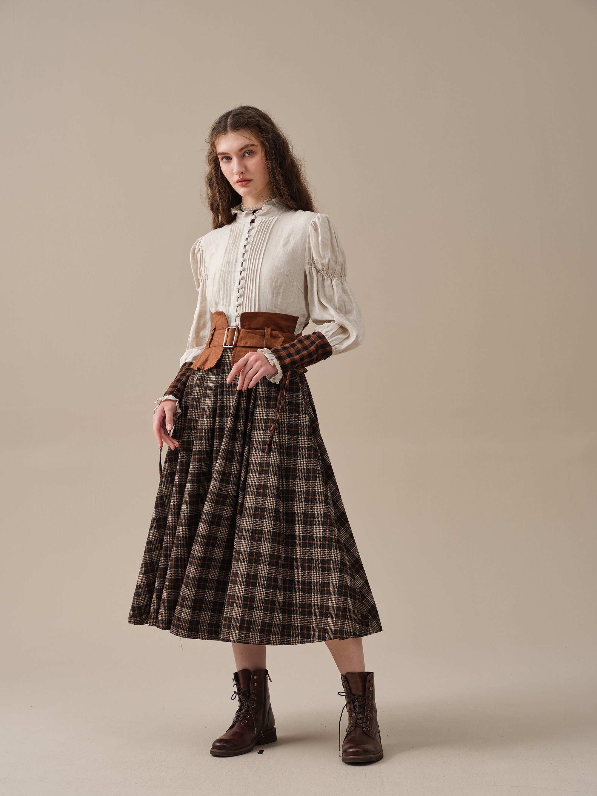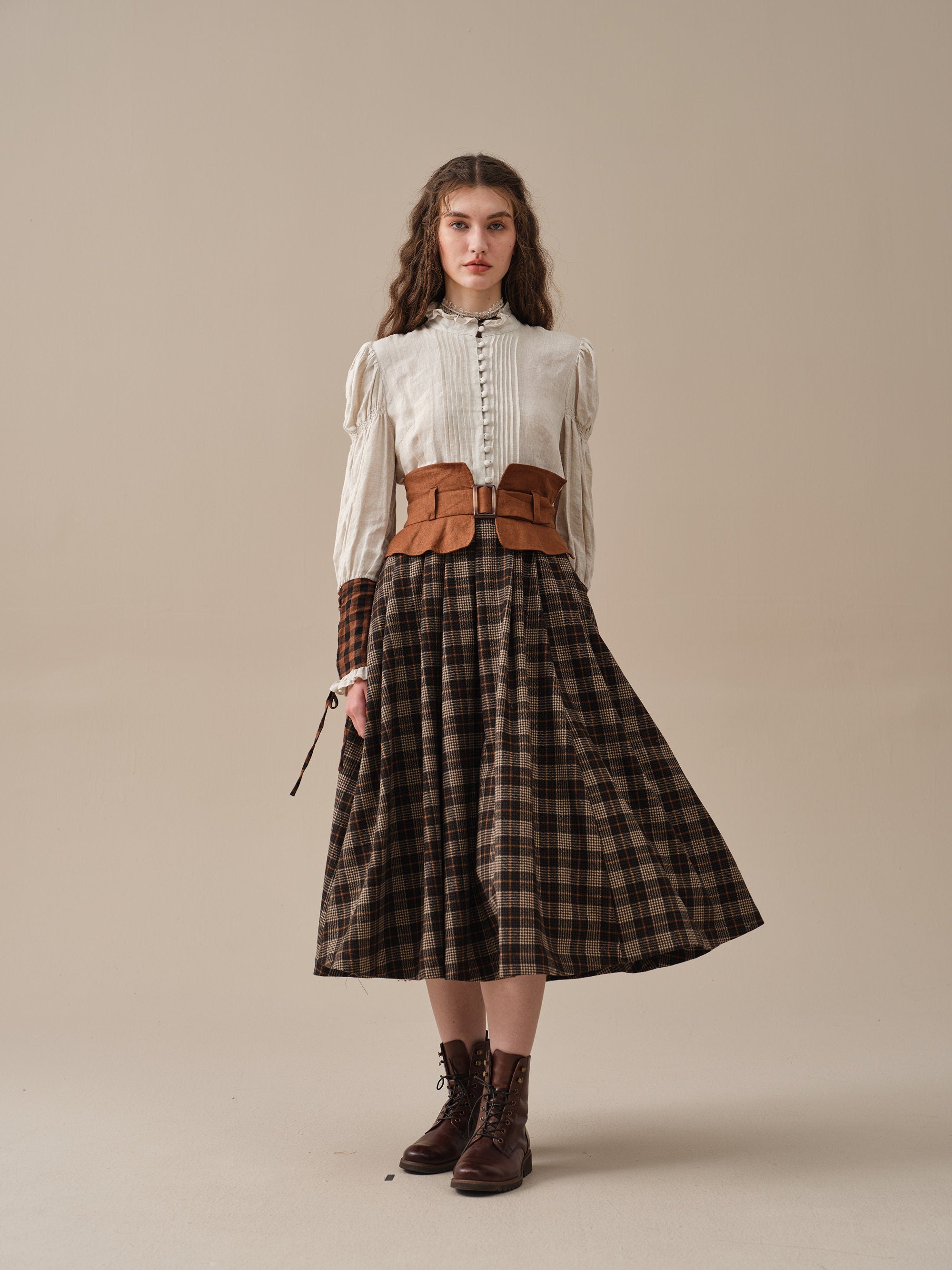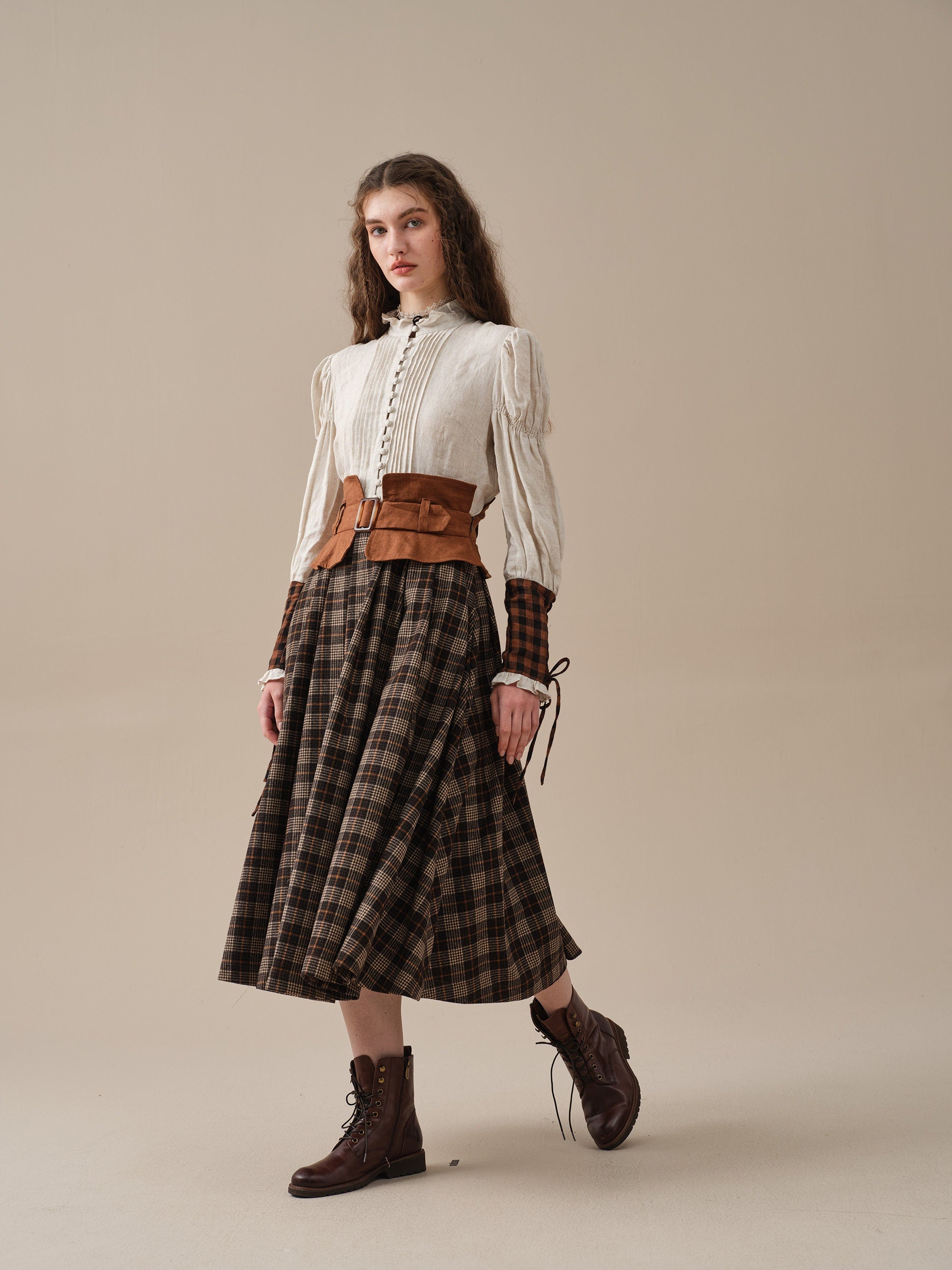 Made from premium wool, this skirt is a warm embrace that will keep you enchanted throughout the day. The skirt's graceful silhouette and delicate plaid pattern evoke a sense of romance, transporting you to a bygone era of refined charm.