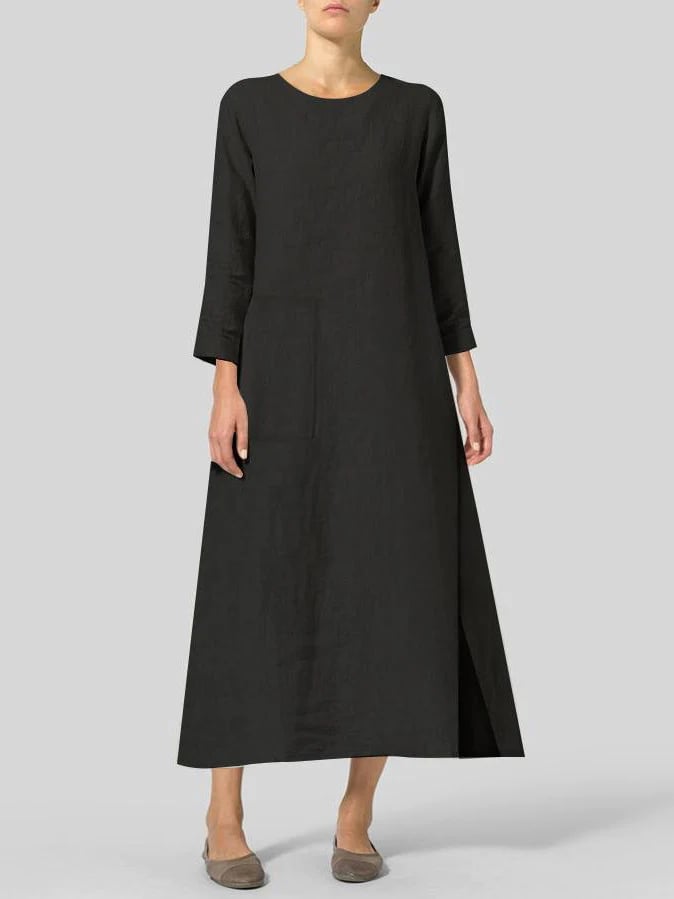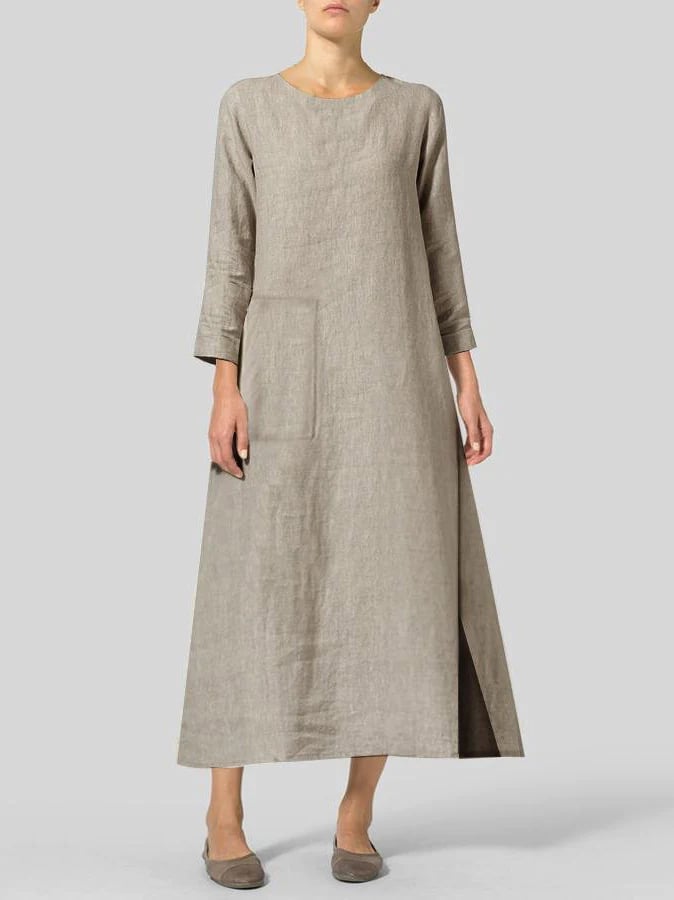 This is a dress made of high quality eco-friendly natural cotton and linen blend. Knee-length half placket neckline in a classic versatile color. It not only brings you a comfortable wearing experience, but also enhances your fashion and elegance.
