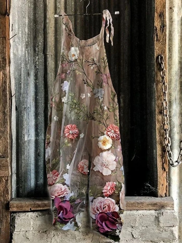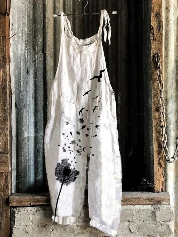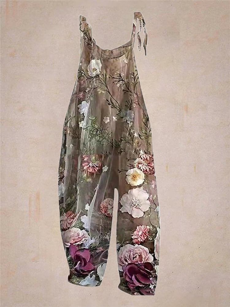 Women's Vintage Oil Painting Print Casual Bib Jumpsuit