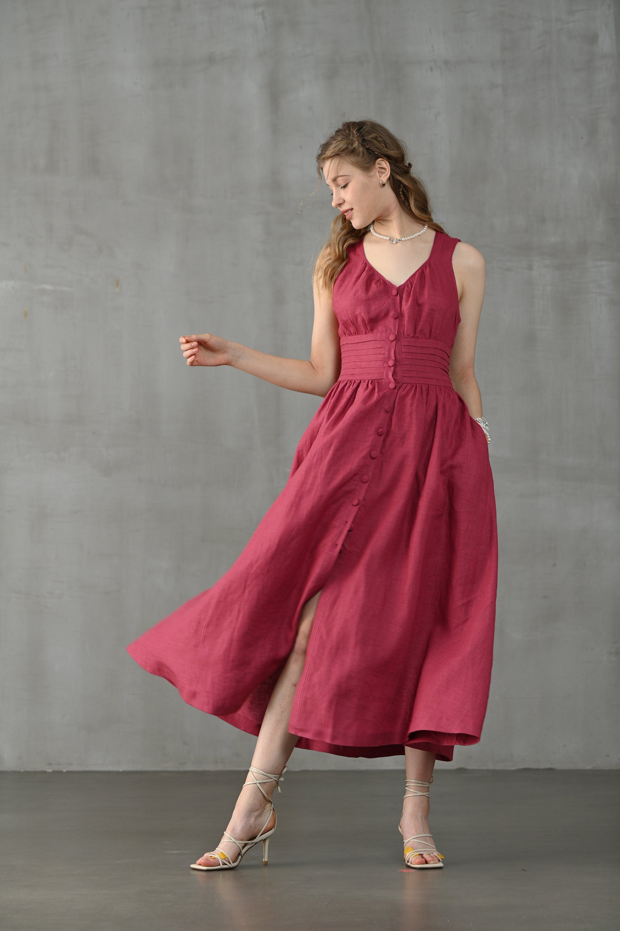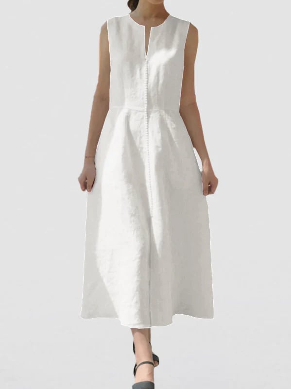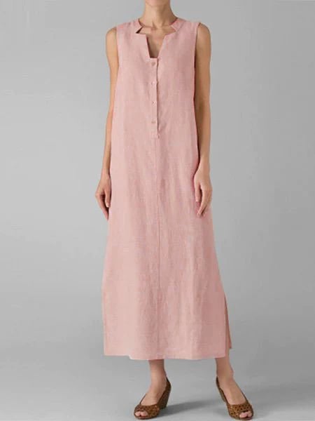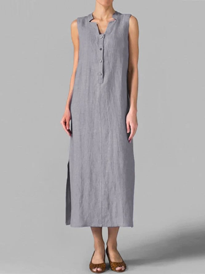 V-Neck Waisted Cotton And Linen Hem Slit Sleeveless Dress