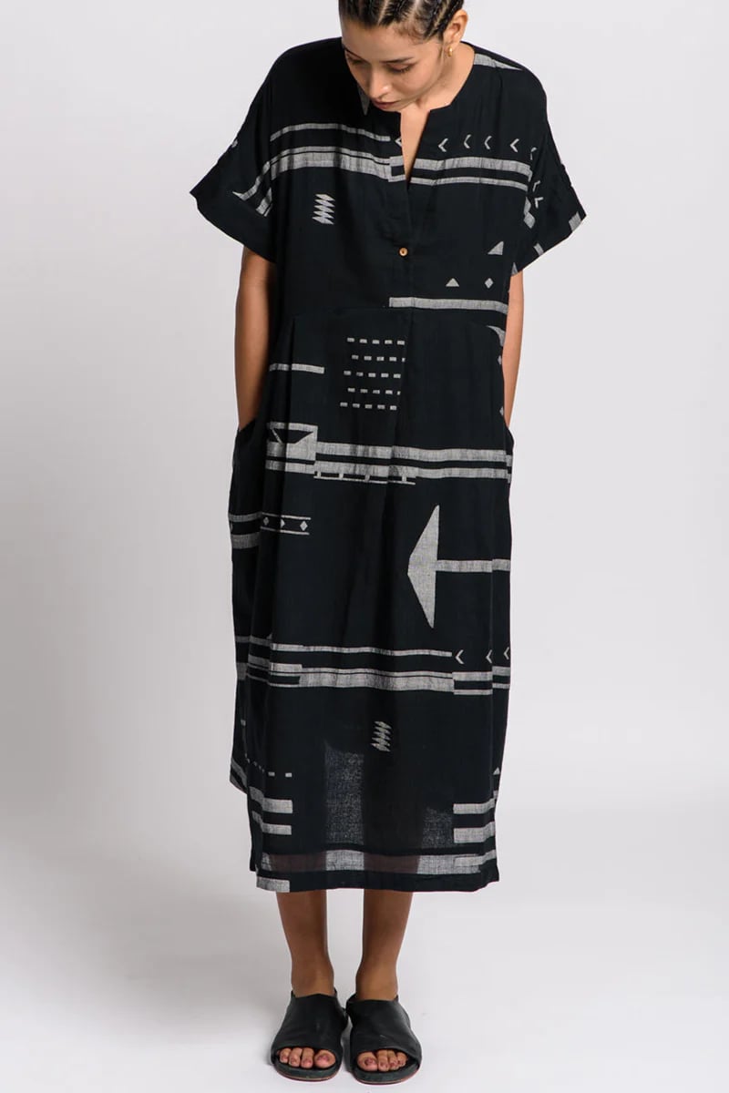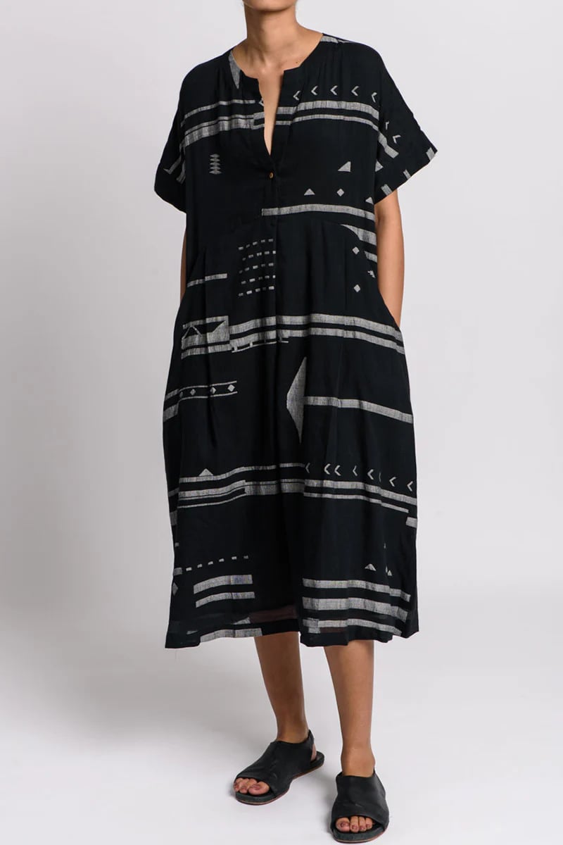 V Neck Short Sleeve Print Pocket Straight Casual Linen Midi Dress