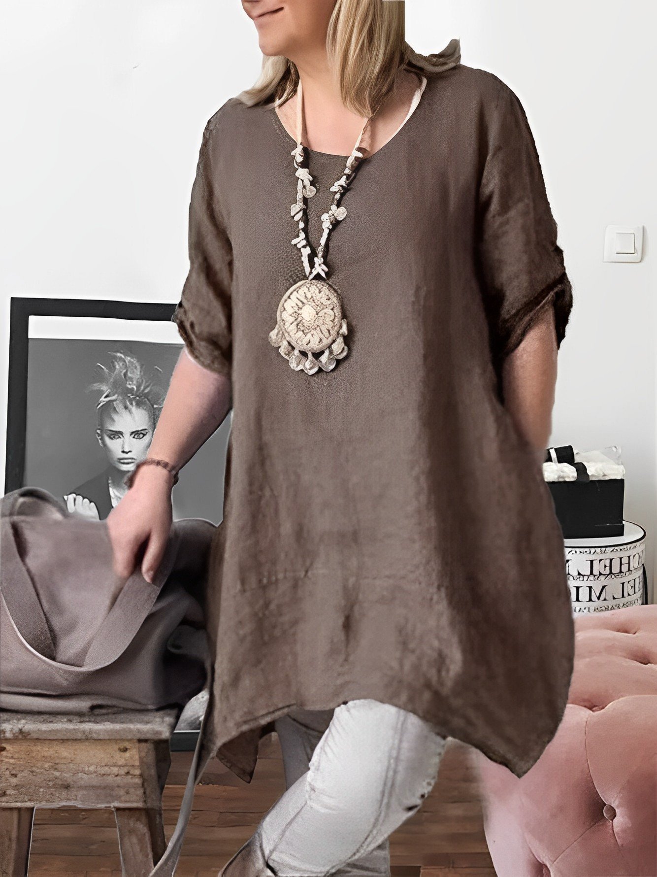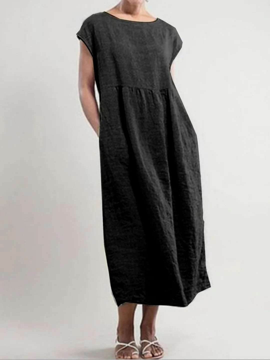 Solid Color Short Sleeve Loose Crinkled Cotton Linen Pocket Dress