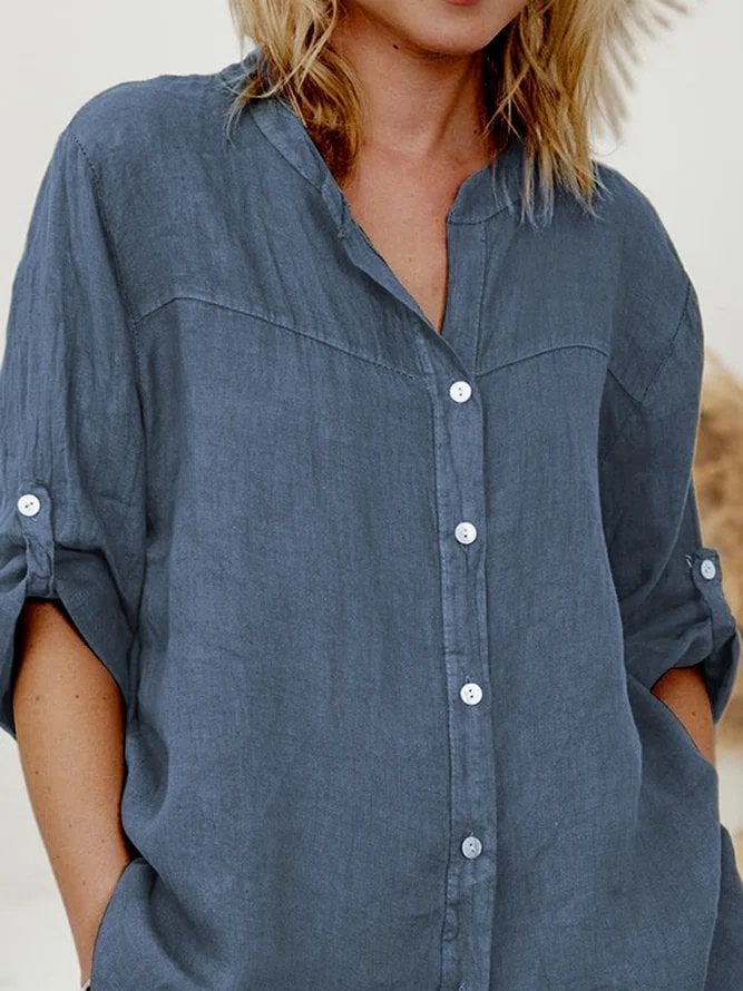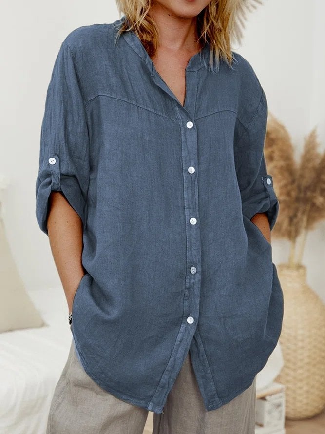 Solid Color Three-quarter Sleeve Stand Collar Cotton Linen Casual Shirt