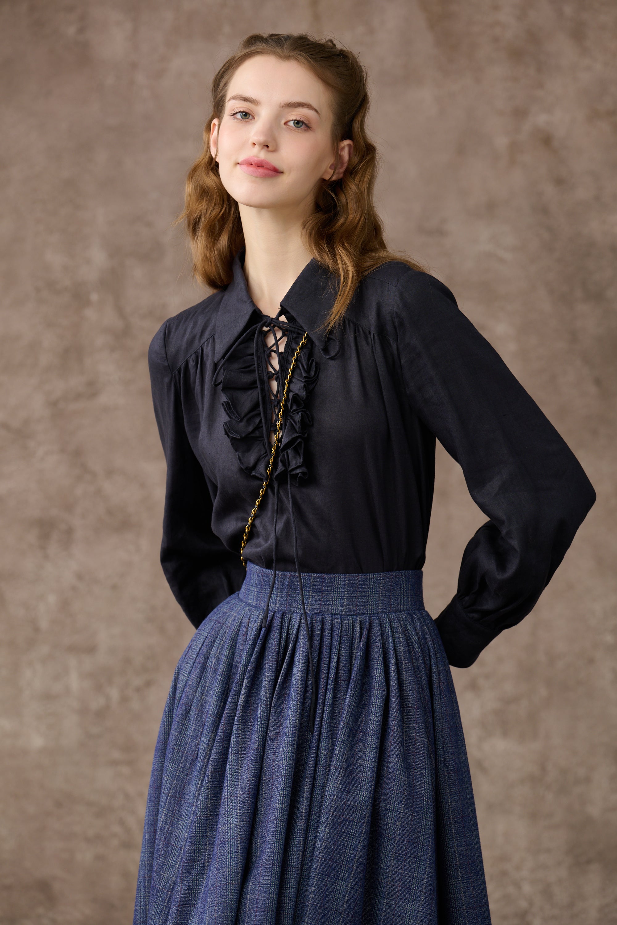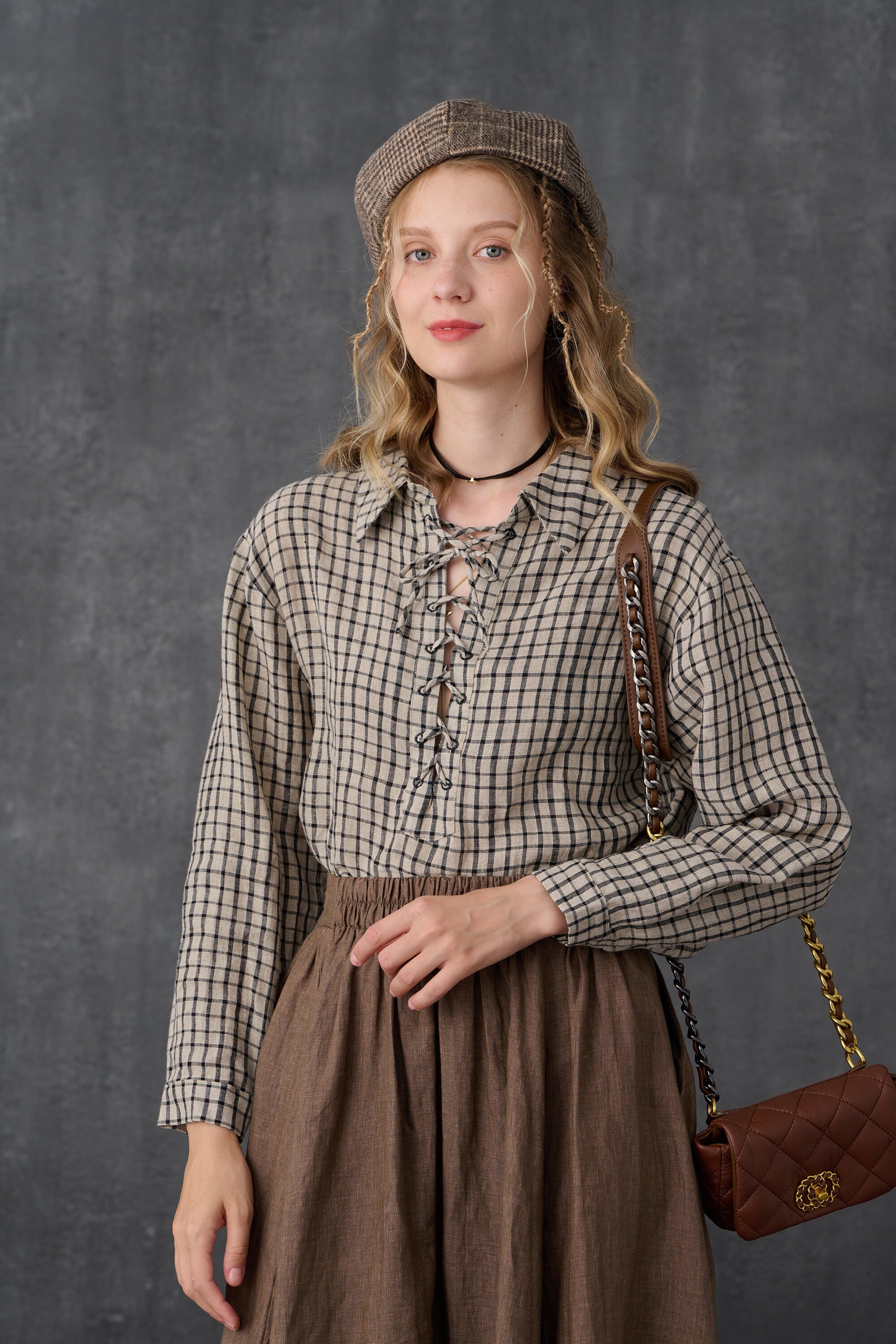 Incense 15| checked lace-up linen shirt