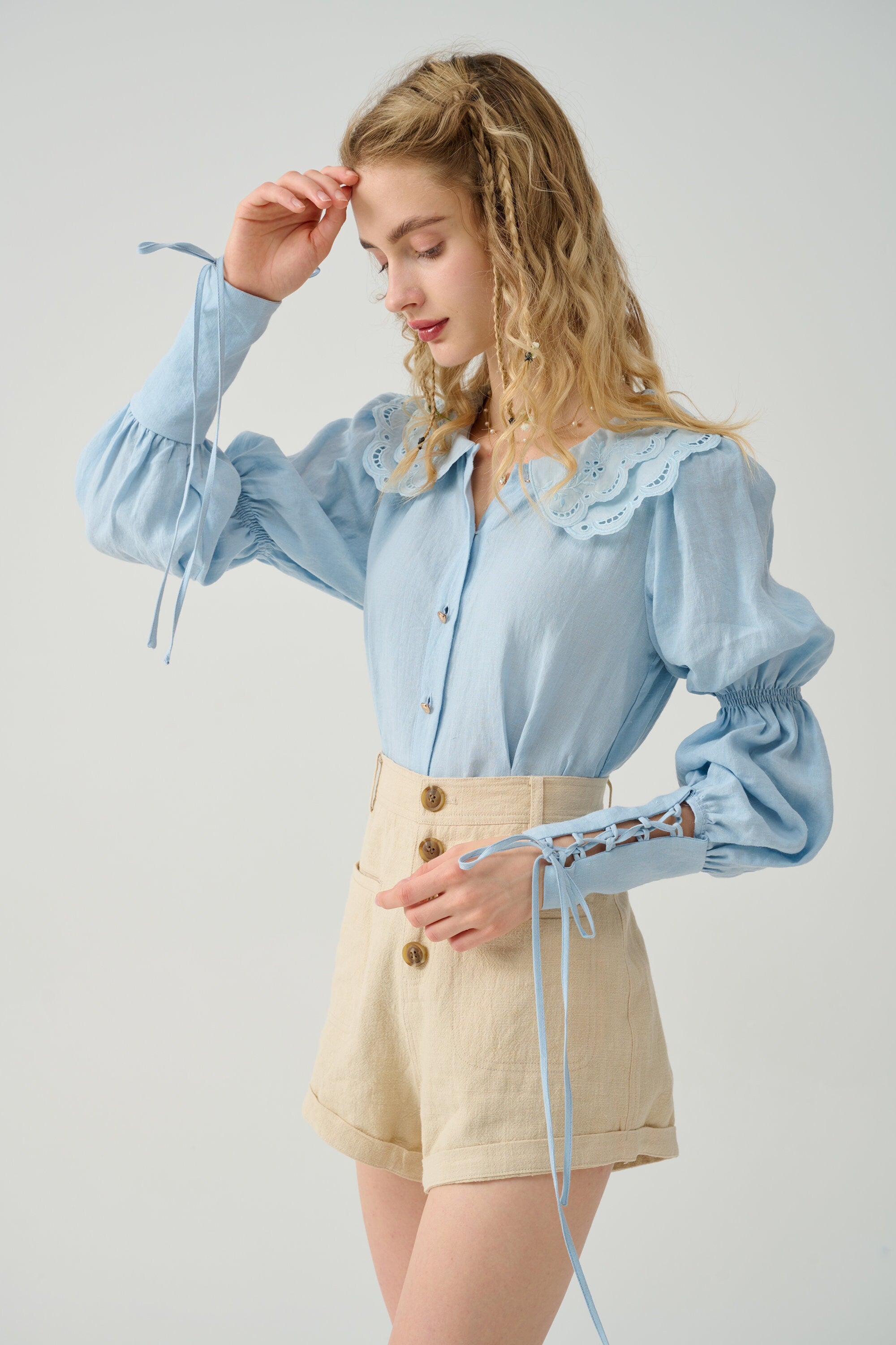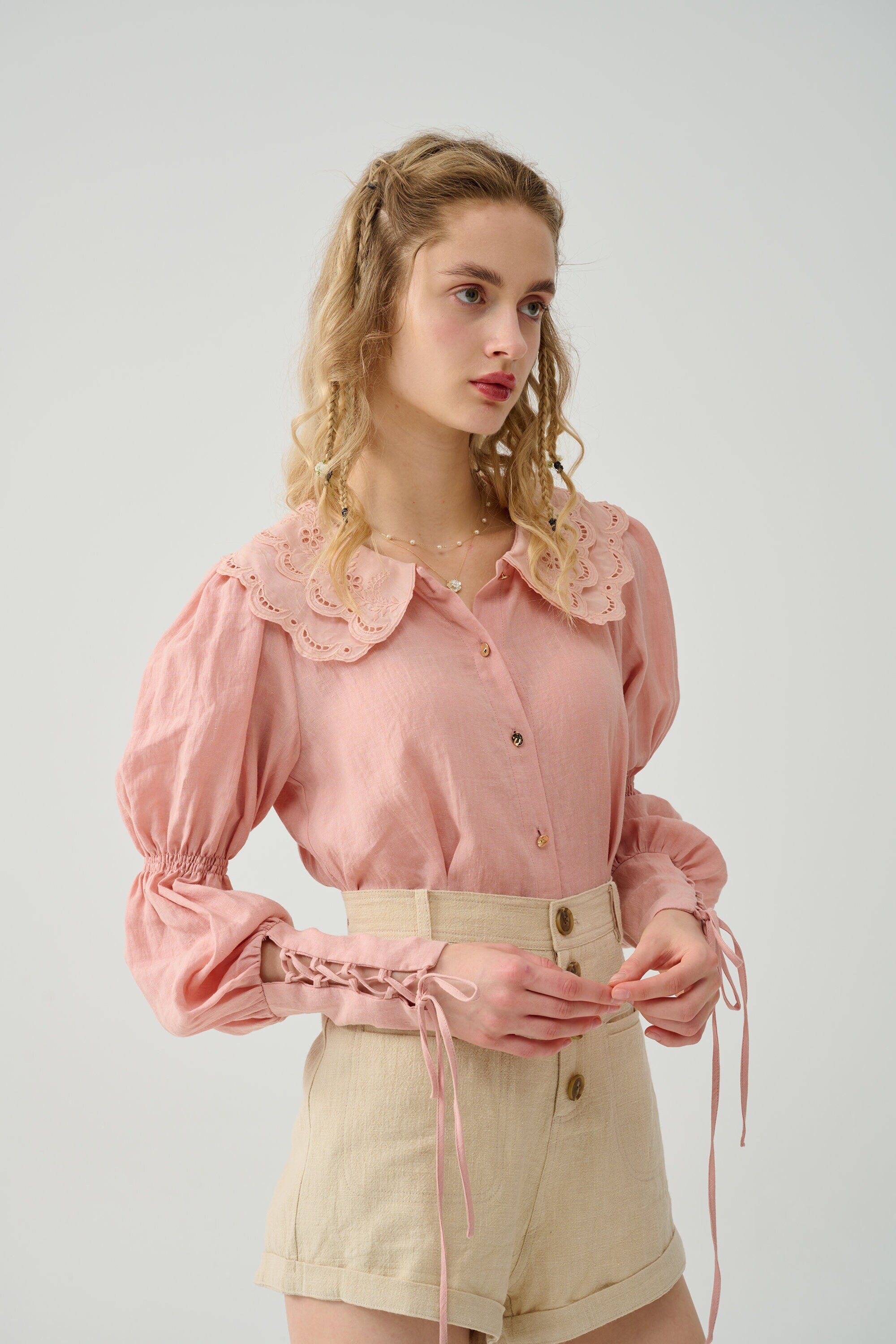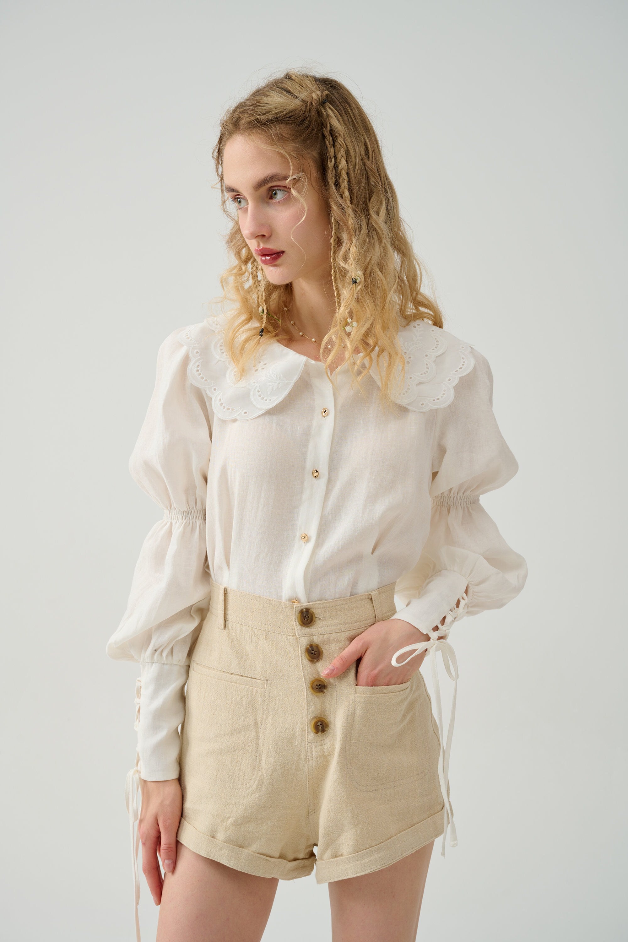 Elastic pleated cotton and linen long-sleeved Off shoulder shirt