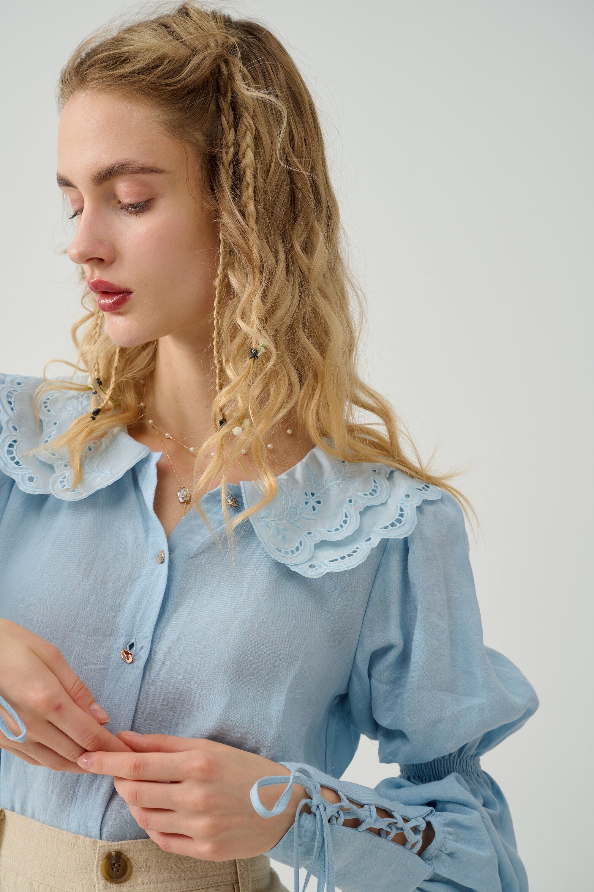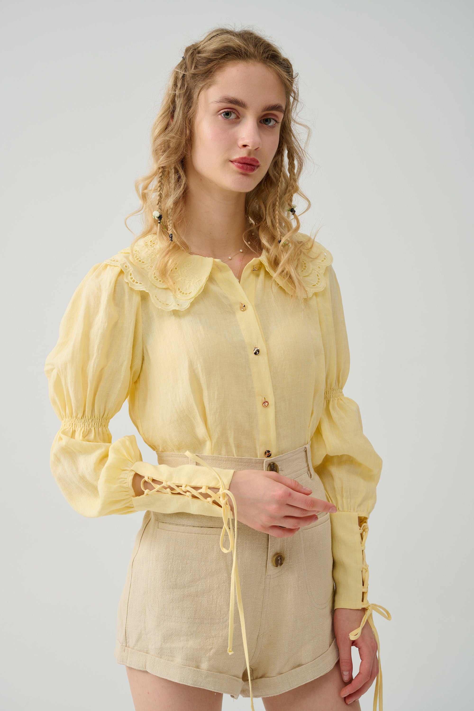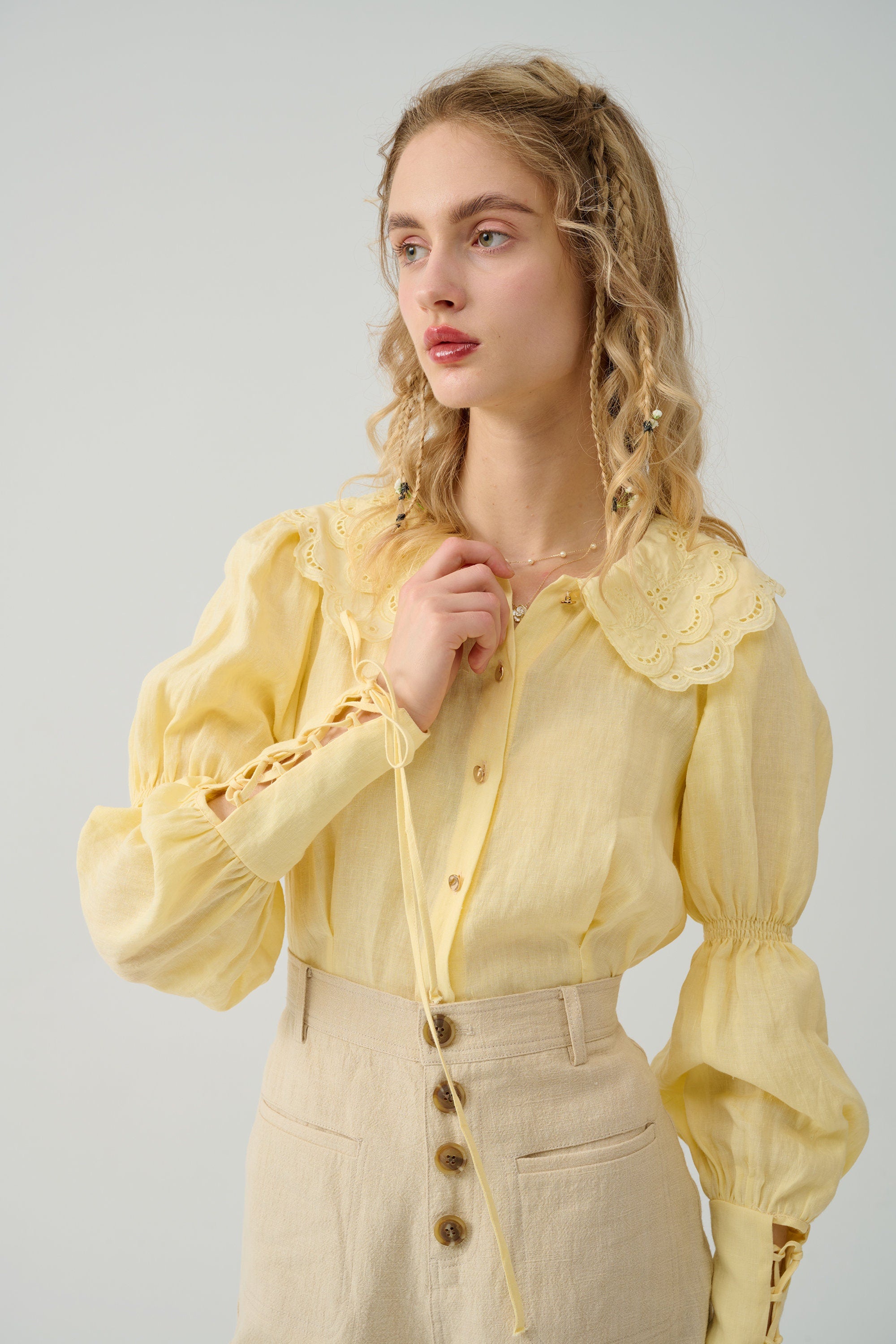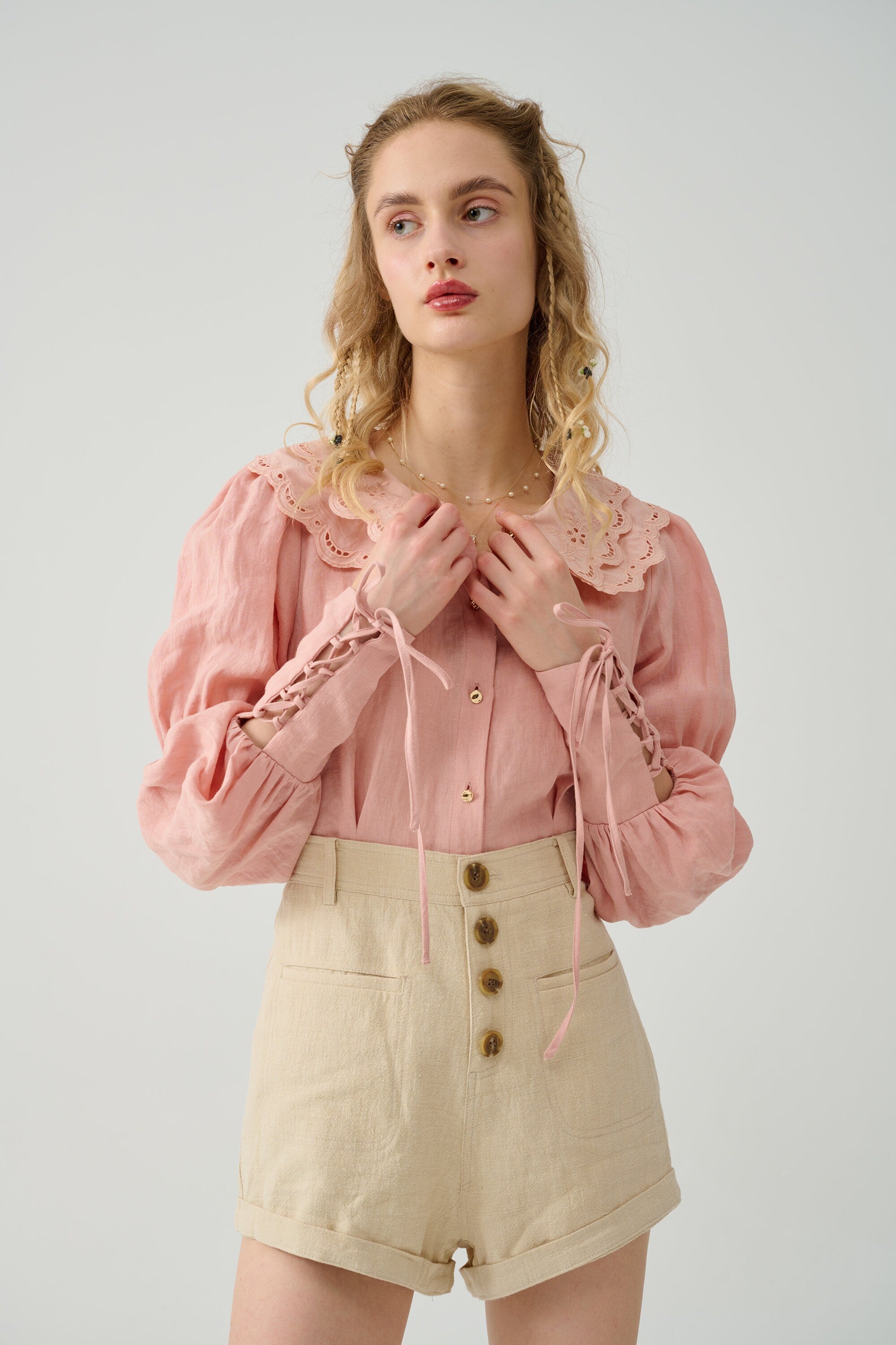 Elastic pleated cotton and linen long-sleeved Off shoulder shirt