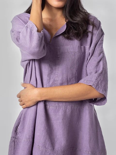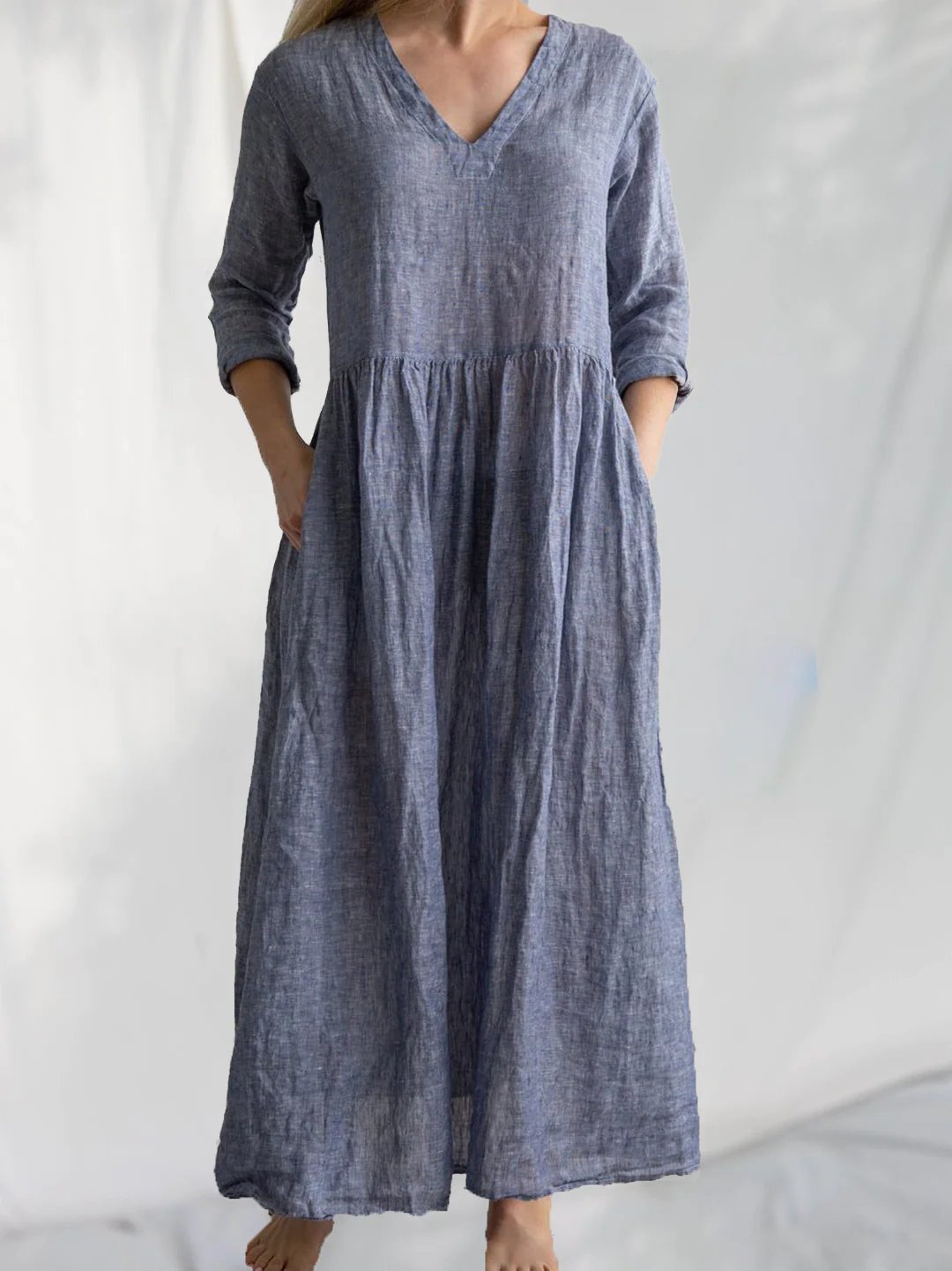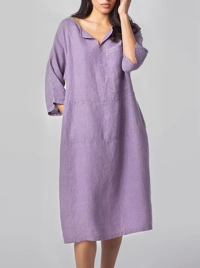 Fashion V-Neck Loose Pocket Mid-Sleeve Mid-Sleeve Cotton Linen Dress