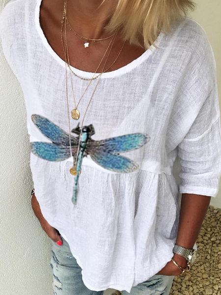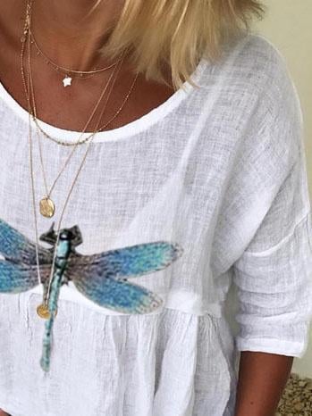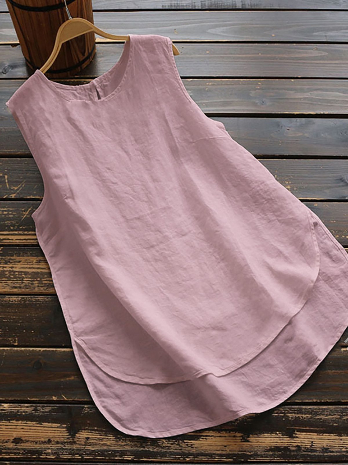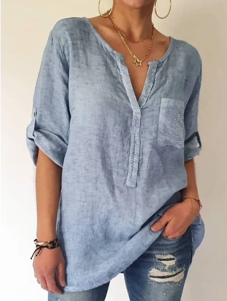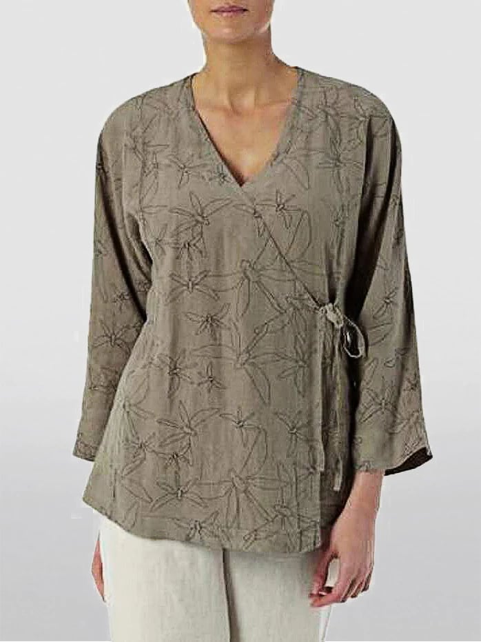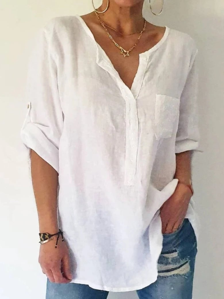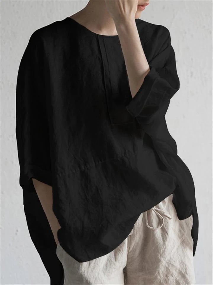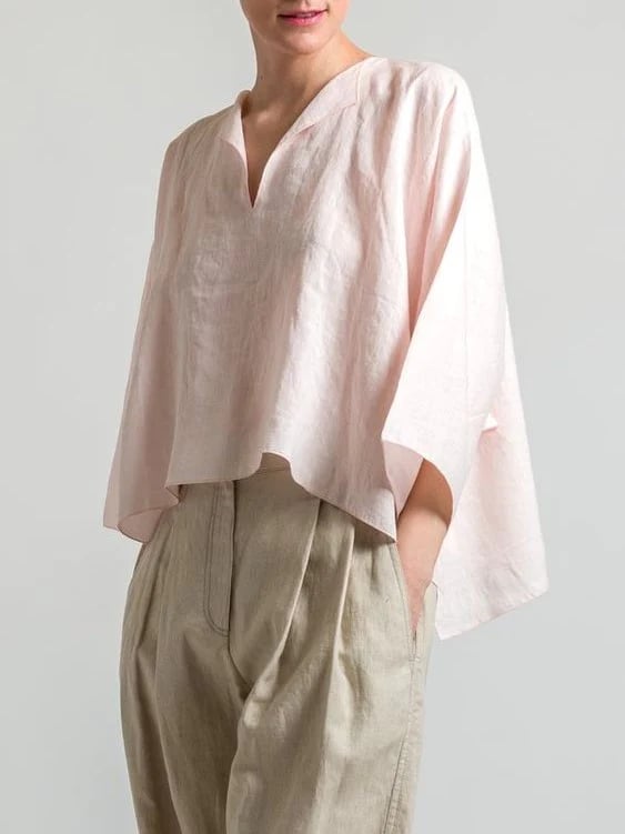 Cotton-Linen V-Neck Loose Back Swing T-Shirt