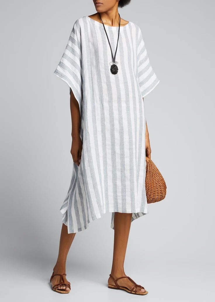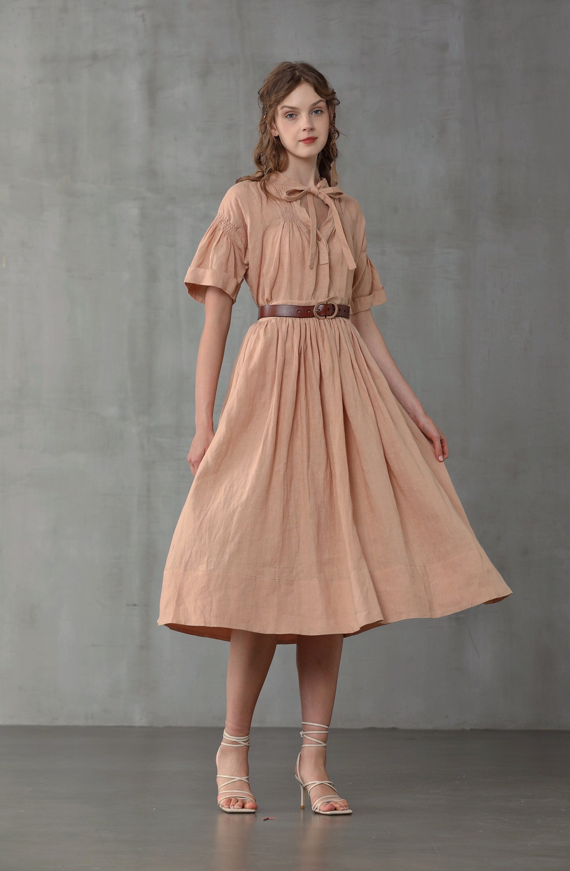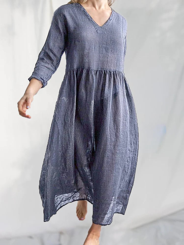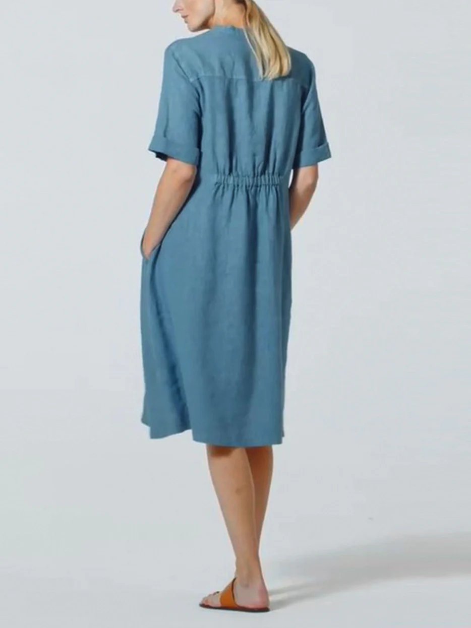 Cropped Sleeves Round Neck Cotton And Linen Comfort Dress