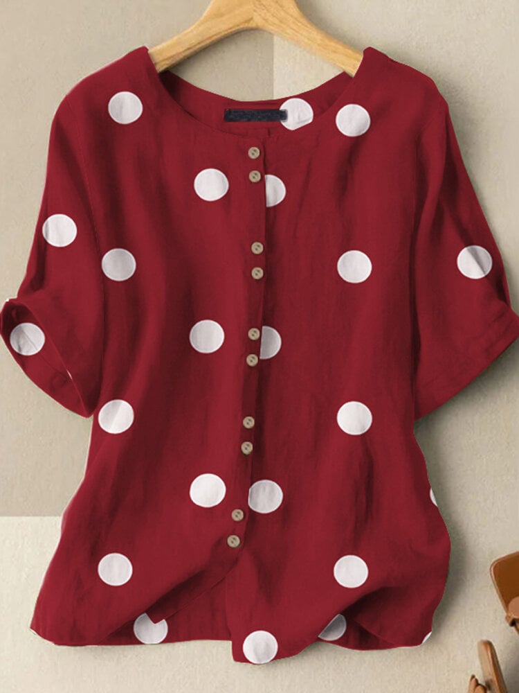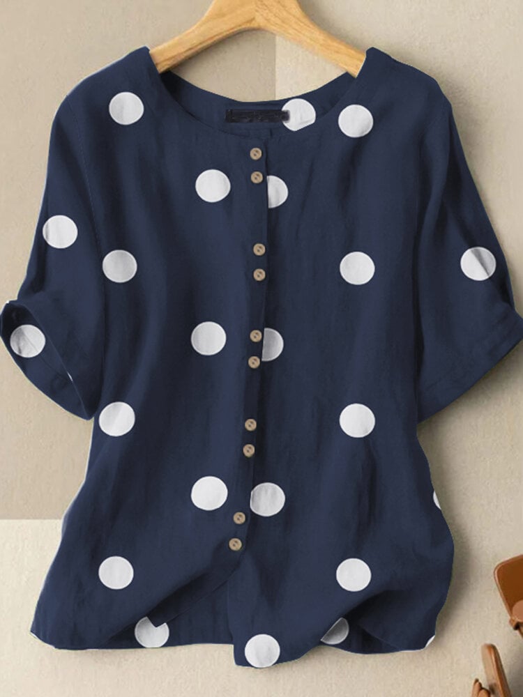 Dot Print Button Front Crew Neck Half Sleeve Blouse